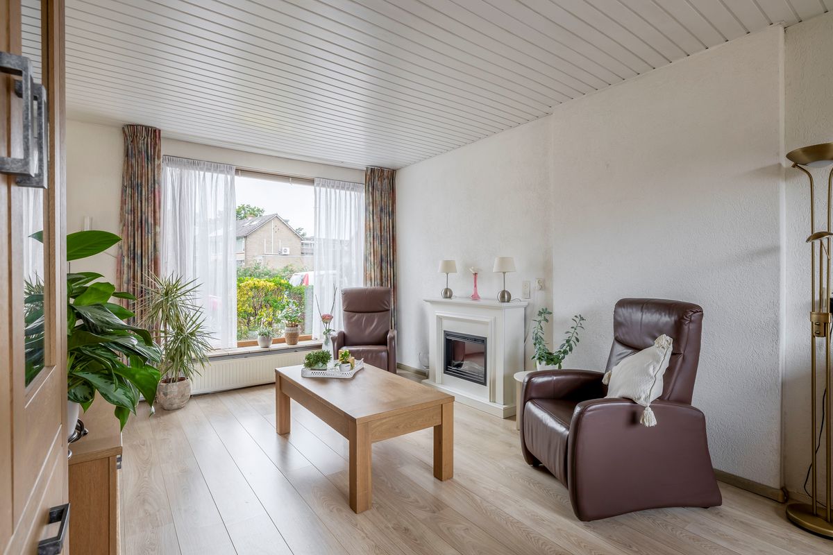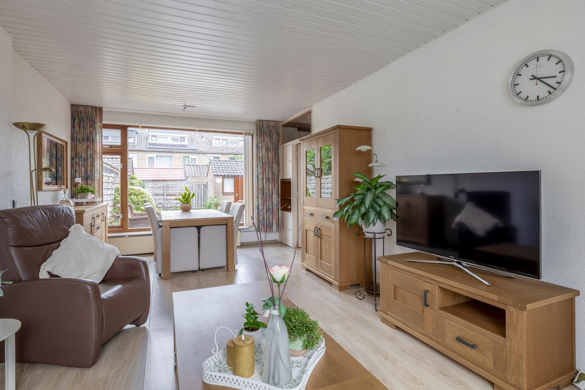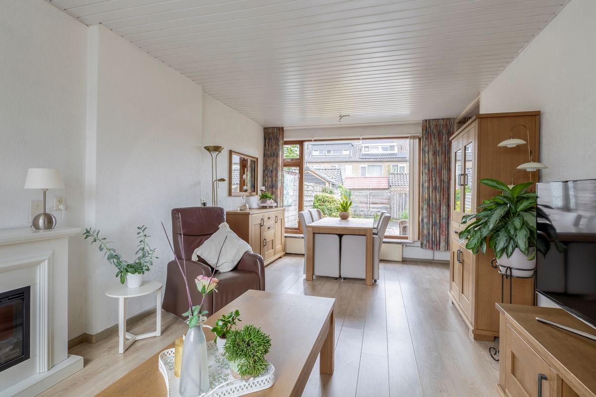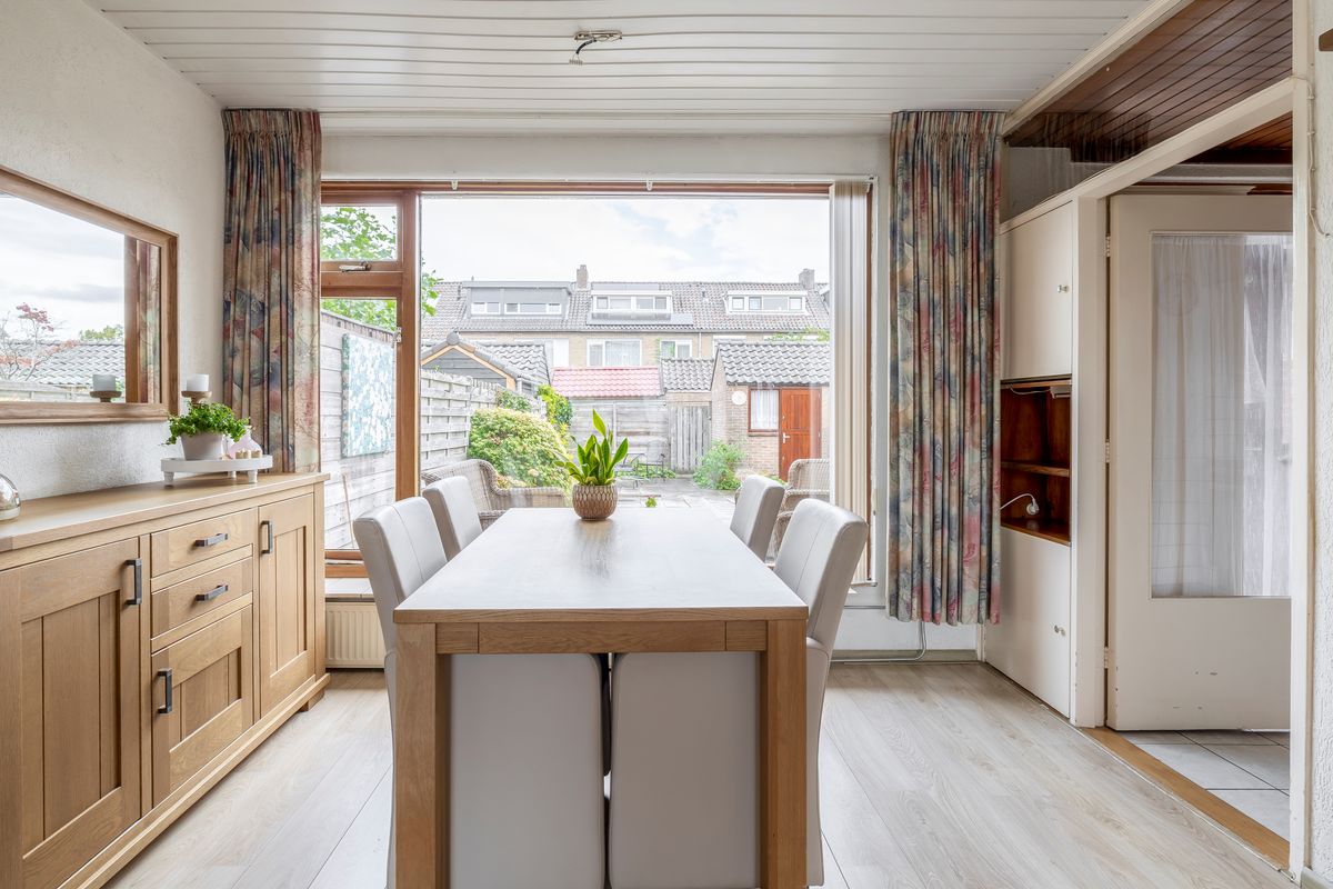 De woonkamer heeft veel lichtinval door de grote ramen. Vanuit de woonkamer kun je met een deur rechtstreeks naar de keuken. De keuken heeft een rechte opstelling van het keukenblok en is met 8,50m² oppervlak heel ruim. Er zijn twee inbouwkasten in de keuken aanwezig. Het gezamenlijk oppervlak van woonkamer en keuken bedraagt circa 32,00m². Vanuit de keuken is er een deur die toegang geeft tot de tuin.