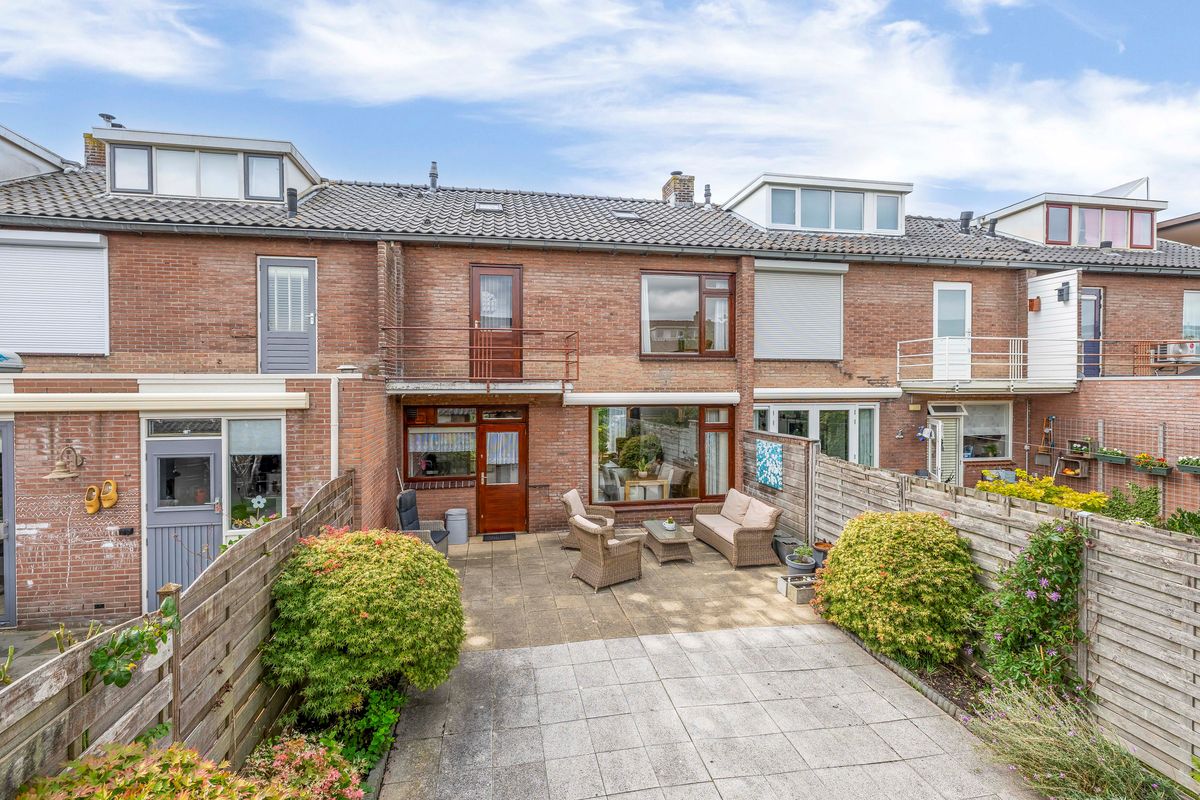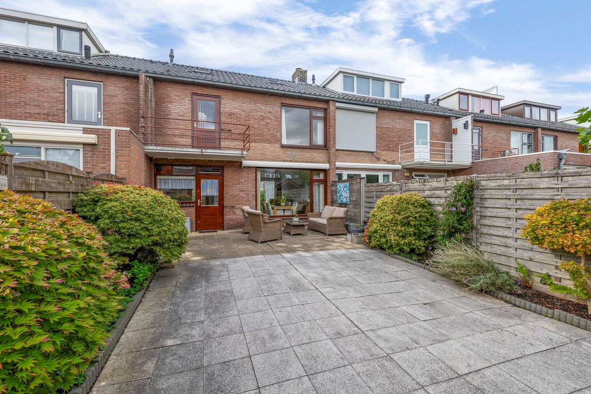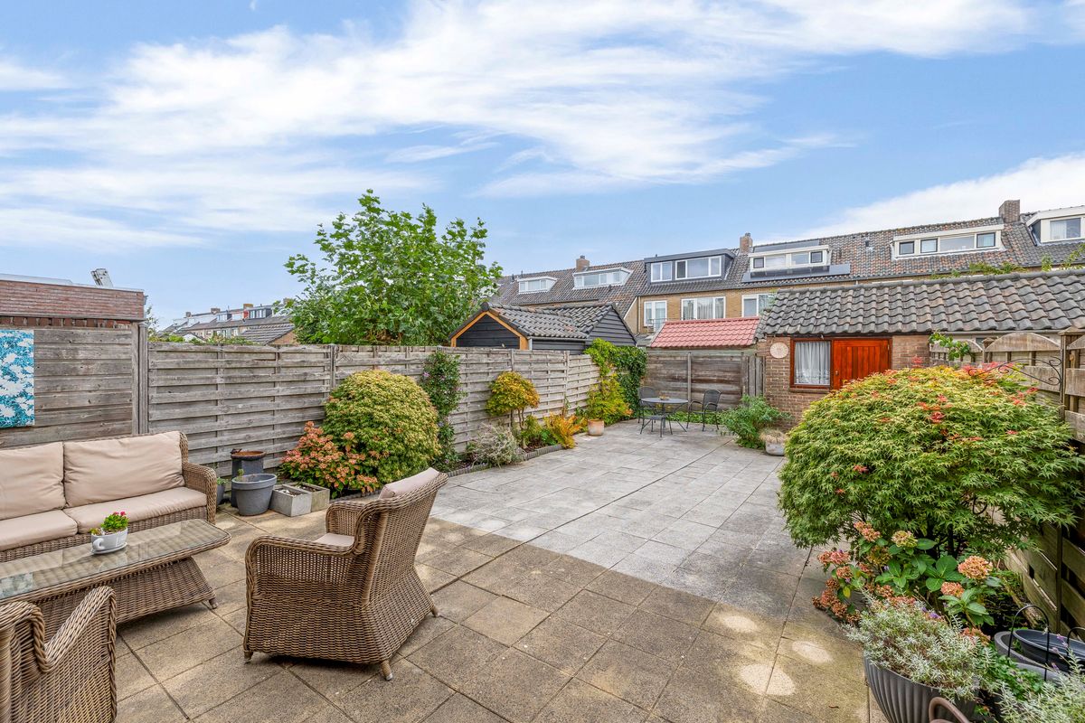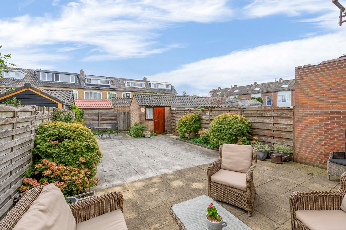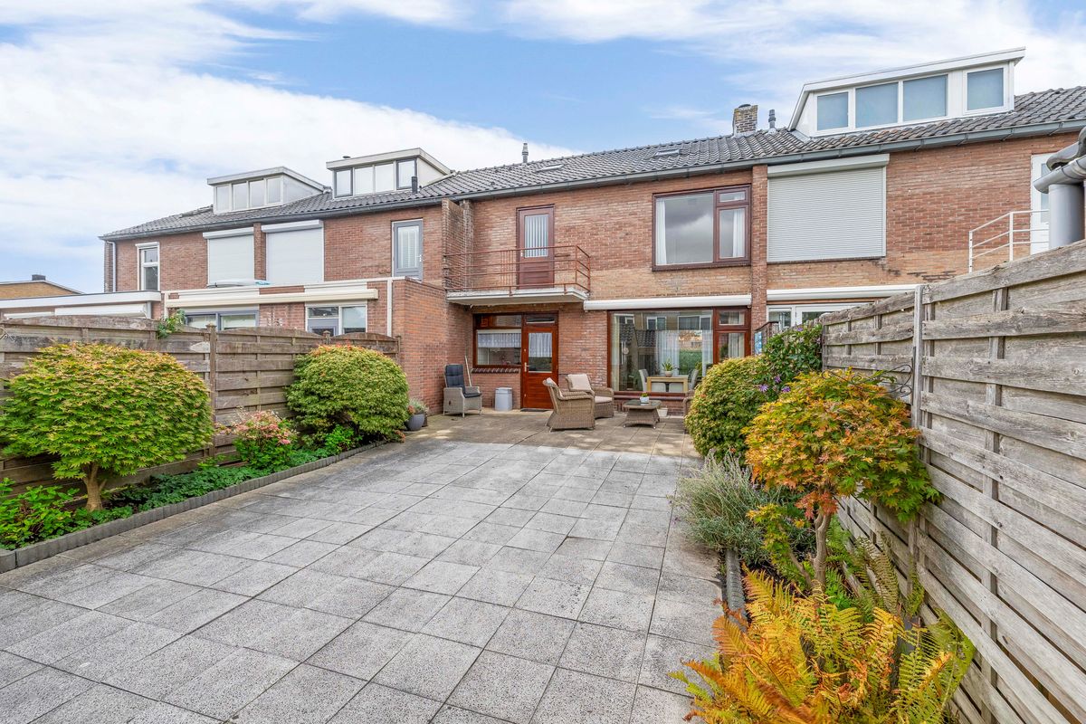 De verzorgde achtertuin ligt op het oosten. De tuin is grotendeels bestraat en langs de randen zijn borders met vaste beplanting. Door de lengte van maar liefst 14,40 meter heb je van de ochtend tot in de avond de zon in de tuin. Achterin de tuin staat de ruime stenen berging. Er is een achterom aanwezig. Aan de achtergevel van het huis is een elektrisch bediend zonnescherm gemonteerd.
