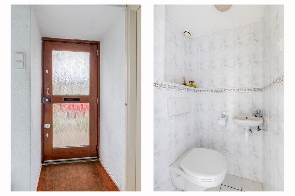 Via de verzorgde voortuin kom je bij de centraal geplaatste voordeur. Je komt binnen in een zeer royale hal met hier de rechte trap naar de verdieping, de meterkast en het toilet. Het toilet beschikt over een vrij hangend closet, een fontein en is geheel betegeld. Vanuit de hal is er rechtstreeks toegang naar de woonkamer en naar de keuken.