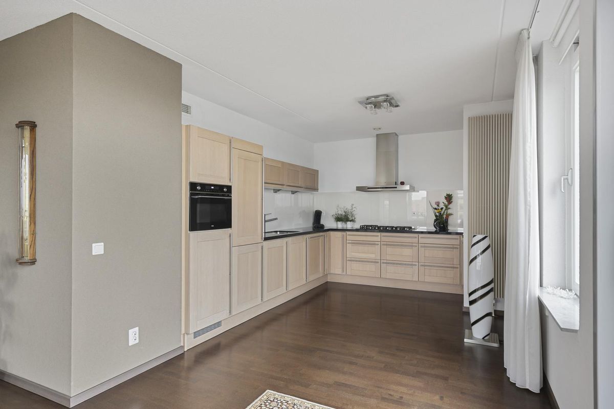 Appartement: bij binnenkomst via de centrale hal opent zich een ruime en overzichtelijke indeling. De woonkamer bevindt zich aan de linkerzijde en is afgewerkt met een eikenhouten parketvloer. Vijf grote aluminium draai-kiepramen zorgen hier voor een zee aan daglicht, terwijl elektrisch bedienbare screens het comfort versterken. De woonkamer (v.v. airco) vloeit moeiteloos over in het eetgedeelte en de eikenhouten keuken, die is uitgevoerd in een warme lichtbruine kleurstelling met een zwart granieten werkblad. De keuken beschikt over een 1,5 spoelbak met zeepdispenser, onder- en bovenkasten met inbouwspots en diverse apparatuur, waaronder een 5-pits gaskookplaat met afzuigkap, vaatwasser, combi magnetron/oven (2023), pannencarrousel, diepvries en een halfhoge koelkast. Via een brede schuifpui is het, op het zuiden gelegen, terras bereikbaar.