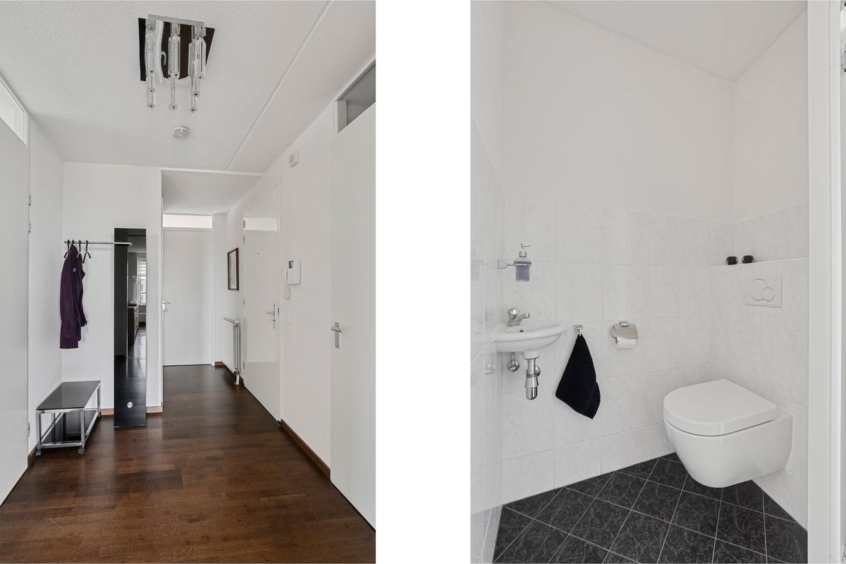 Een aparte toiletruimte in dezelfde stijl als de badkamer is uitgerust met een wandcloset en een hoekfontein. Beide geven een frisse uitstraling. De inpandige berging biedt plaats aan de cv-opstelling (Breman Intergas HRE, 2020), mechanische ventilatie en aansluitingen voor wasmachine en droger.