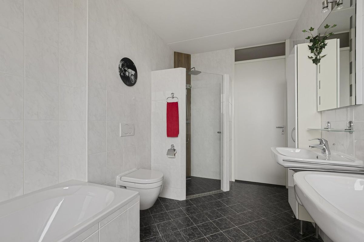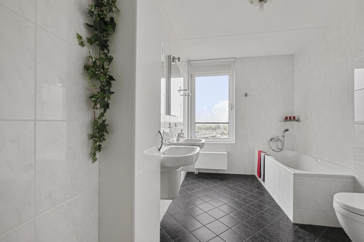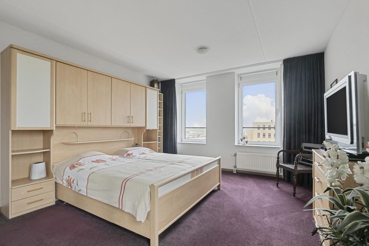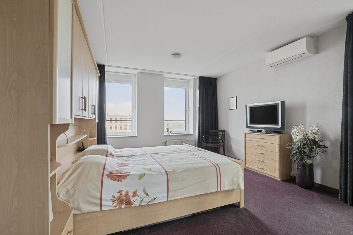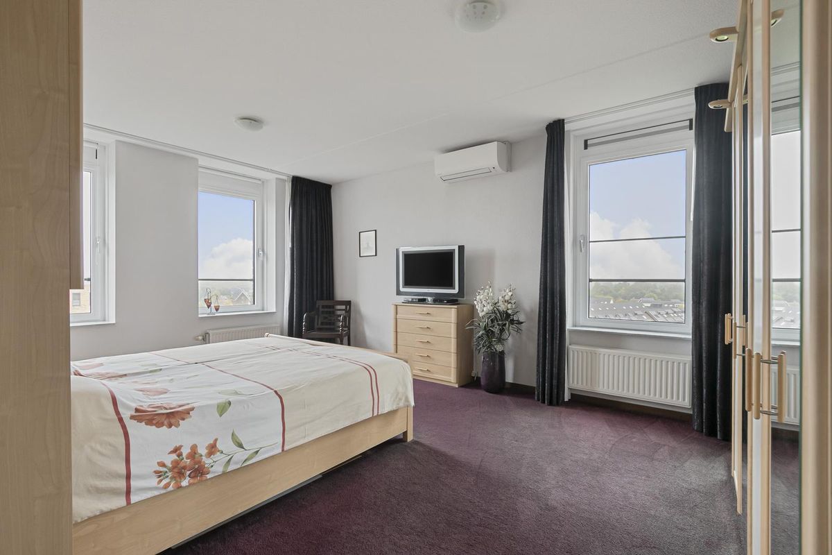 De hoofdslaapkamer bevindt zich aan de voorzijde van het penthouse en is bijzonder licht dankzij twee grote ramen die in het verlengde liggen van de woonkamerkozijnen. De kamer is voorzien van vloerbedekking en een tweede airco-installatie. Aangrenzend bevindt zich de ruime badkamer, die is afgewerkt met witte wandtegels en een vloer met robuuste reliëfstructuur. Ingericht met een ligbad, toilet, dubbele wastafel met spiegel, extra kastruimte en een royale inloopdouche met hand- en regendouche. De vloertegels op de badkamer zijn licht te verwarmen.