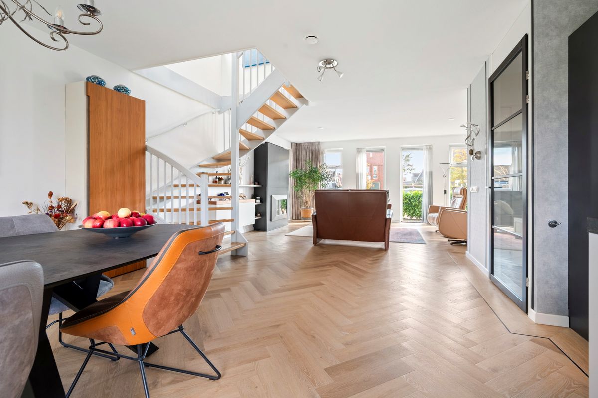 Zoals ook goed zichtbaar is op de foto’s en plattegronden, bieden de verschillende woonruimtes volop gelegenheid om de inrichting ruimtelijk te bepalen en te spelen met licht, lijnen en sfeer. Welke woonstijl je ook hebt, modern, landelijk, bohemian of strand geïnspireerd, ze passen hier allemaal moeiteloos. Een prettige, uitgebalanceerde basis die uitnodigt om er echt je eigen thuis van te maken, mede makkelijk gemaakt door de bijzonder aangename indeling waarin je onder meer het volgende tegenkomt: Op de begane grond tref je een uitnodigende entree met hal, meterkast en toilet, gevolgd door een royale woonkamer met grote raampartijen die zorgen voor een natuurlijke lichtinval en een prettig ruimtelijk gevoel. De woonkamer staat subtiel in verbinding met de woonkeuken. Een sfeervolle leefruimte waarin koken, eten en samenzijn mooi in elkaar overvloeien. Hier vind je onder andere een ruim werkblad en een gezellig schiereiland met plek voor barkrukken, een fijne plek voor een ontspannen ontbijt of om aan te schuiven tijdens het koken.