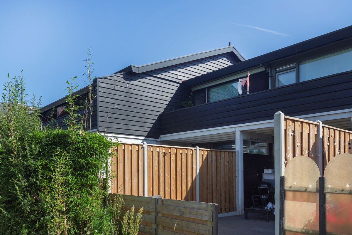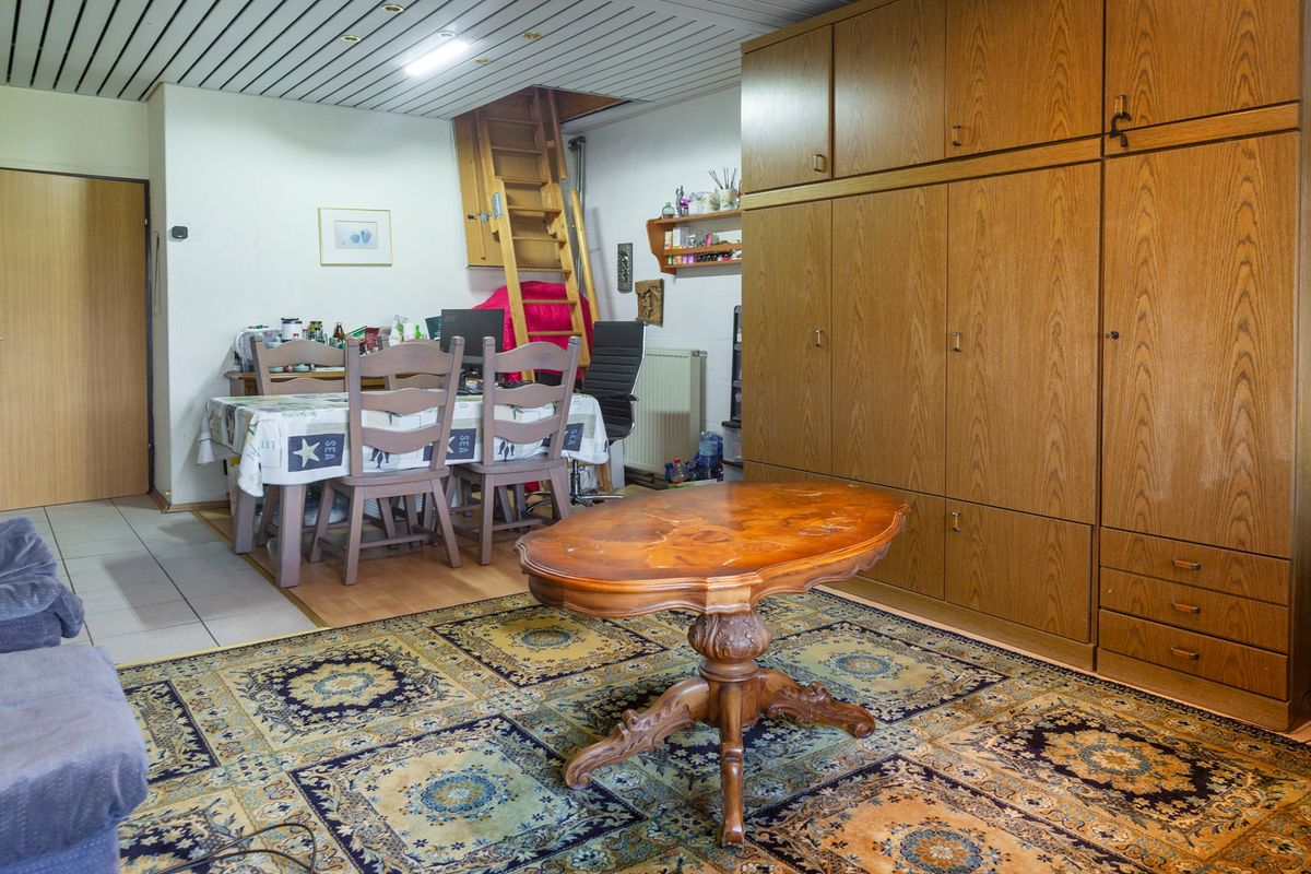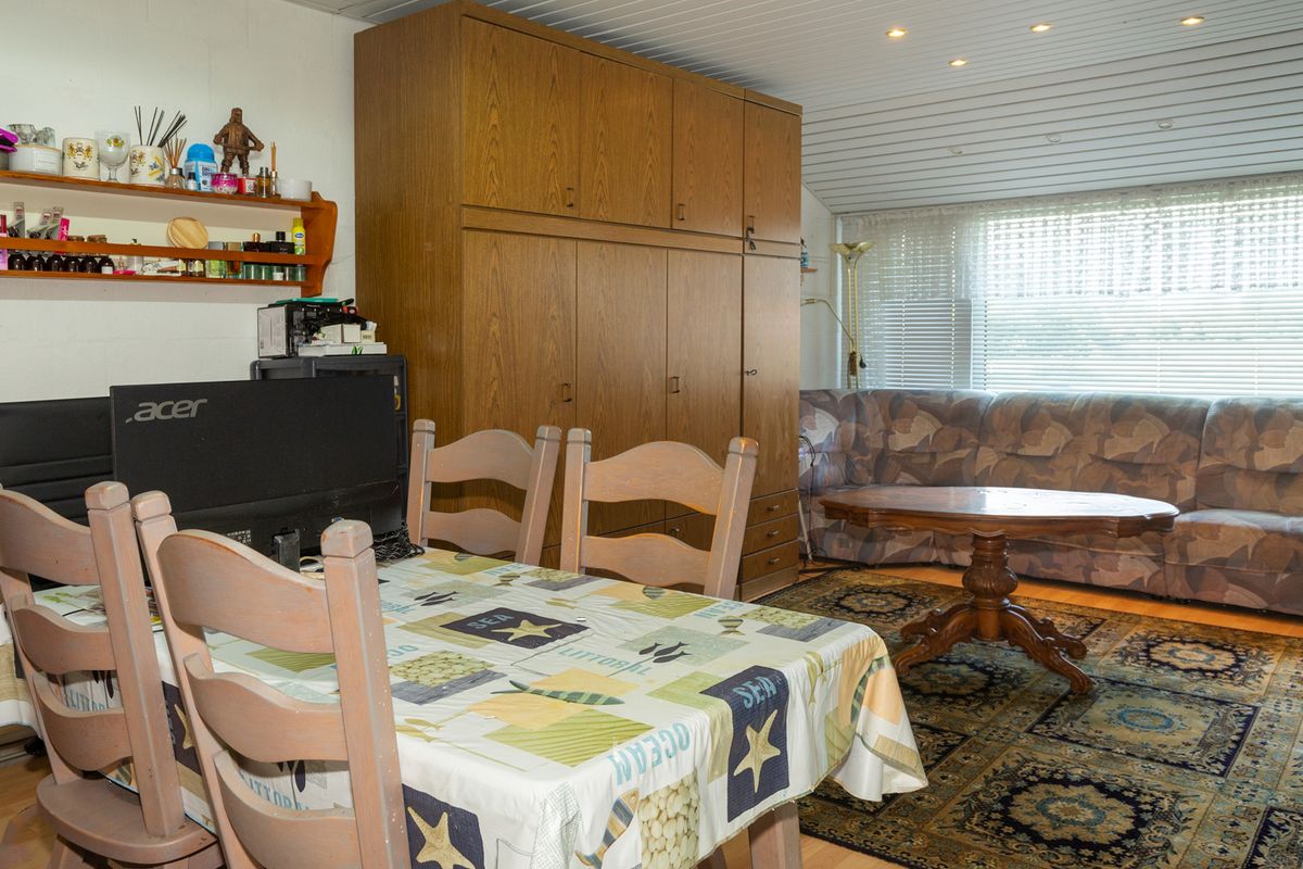De woonkamer is voorzien van een eetgedeelte en een zitgedeelte. De achterpui geeft toegang tot het balkon, gelegen op het zuidwesten. De pui is recent vervangen door kunststof en voorzien van dubbele beglazing.