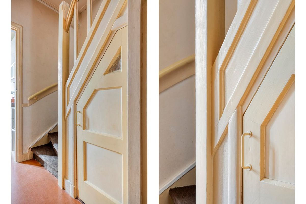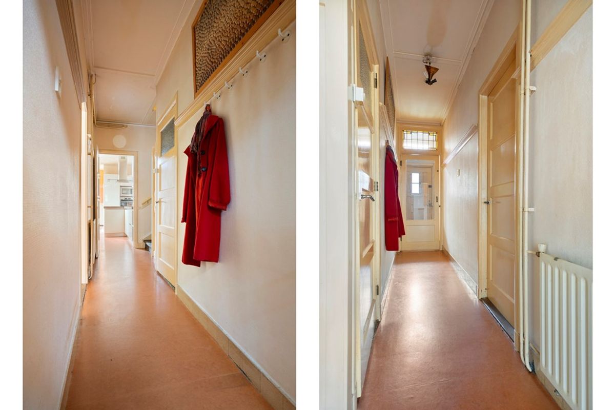 De lange gang geeft toegang tot een modern toilet, de trapkast en de woonkamer. Let ook hier weer op de fraaie paneeldeuren.