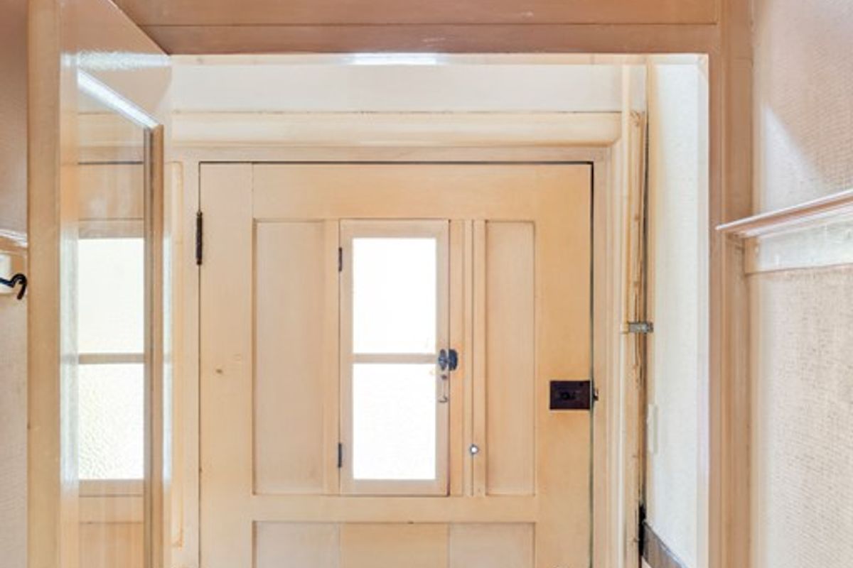 Via de prachtige vestibule kom je binnen; direct vallen de gave glas-in-loodramen op. Onder het huidige vinyl ligt waarschijnlijk nog de originele granito vloer. De woning ademt jaren ’30: paneeldeuren, hoge plafonds en authentieke details zijn volop aanwezig.