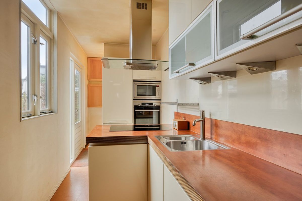 Vanuit de gang bereik je de L-vormige keuken, uitgerust met inductiekookplaat, vaatwasser, koelkast, vriezer, oven en magnetron. Een nette keuken die nog prima jaren mee kan. Aansluitend bevindt zich de bijkeuken, ideaal voor voorraad, lege flessen en een extra koelkast. Tevens de opstelplaats voor de WMA en de CV ketel. Deze ruimte is eenvoudig bij de keuken te betrekken — hoe dat kan, laten we je graag zien.