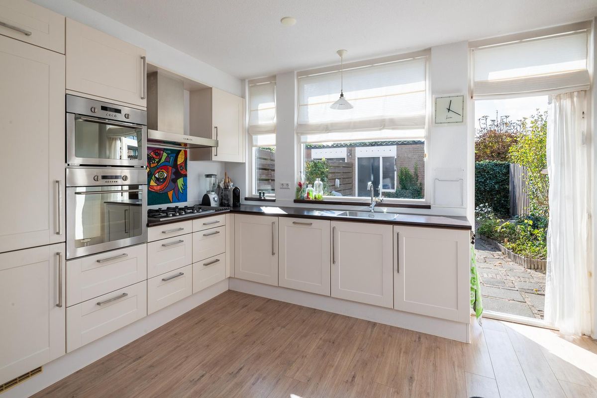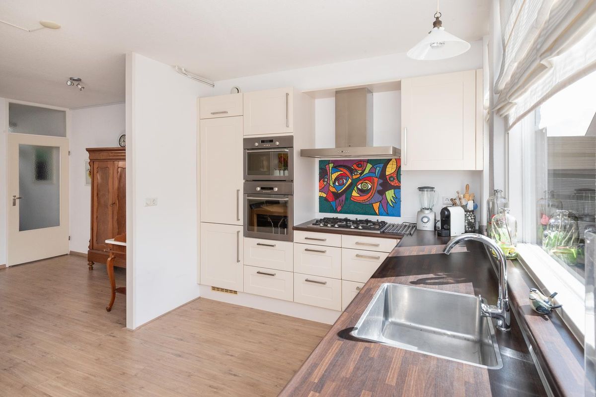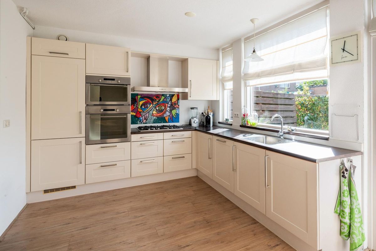 De open keuken is gesitueerd aan de tuinzijde en is voorzien van een hoekopstelling en inbouwapparatuur waaronder vaatwasser, 5-pits gaskookplaat, afzuigkap, koelkast, vriezer (3 laden), oven en magnetron.