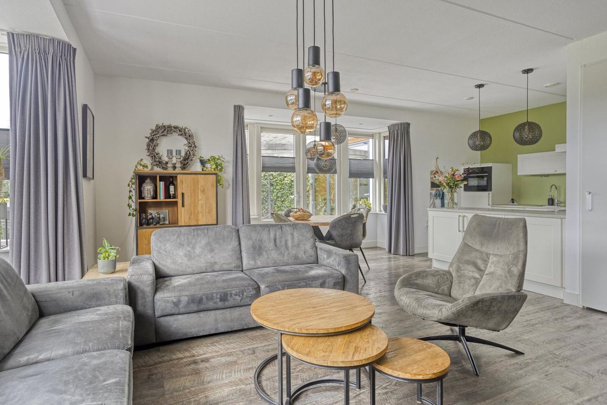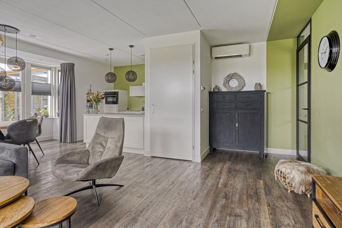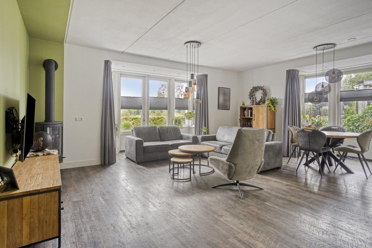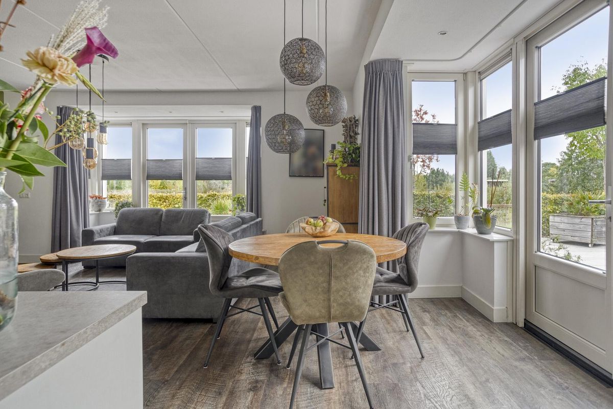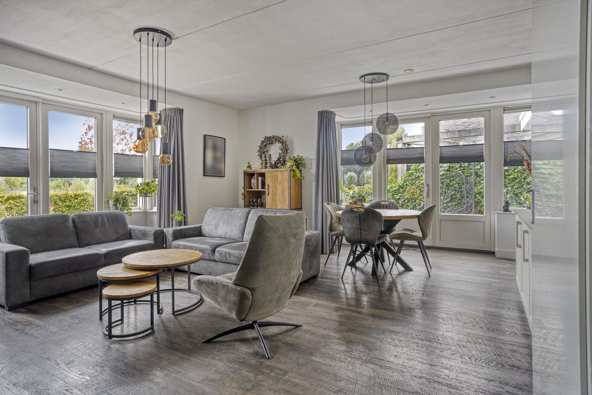 De woonkamer is aan de voorzijde van de woning gesitueerd en heeft veel lichtinval door de vele raampartijen. Aan de voorzijde is een speelse erker met openslaande deuren naar de voortuin. Aan de linkerzijde van de woning is een 2e erker met openslaande deuren naar de zijtuin. De woonkamer is ruim opgezet met mogelijkheid voor het plaatsen van een grote zithoek en 6-persoons eethoek. Tevens is de woonkamer voorzien van een sfeervolle gashaard, praktische provisie/trapkast en airconditioning.
