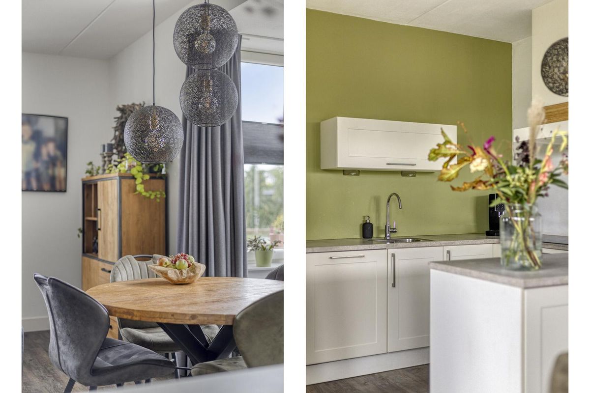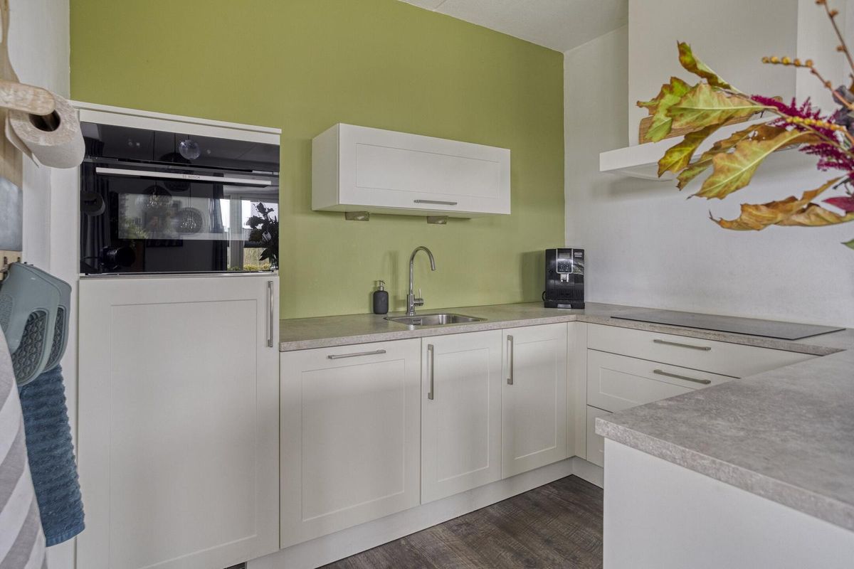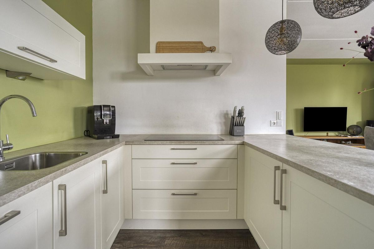 De lichte open keuken is in een U-opstelling geplaatst en voorzien van alle benodigde inbouwapparatuur: koelkast, combimagnetron, vaatwasser, inductiekookplaat en afzuigschouw.