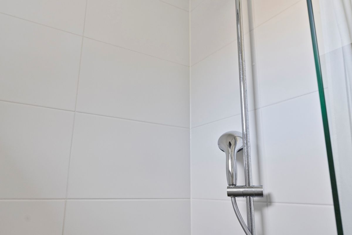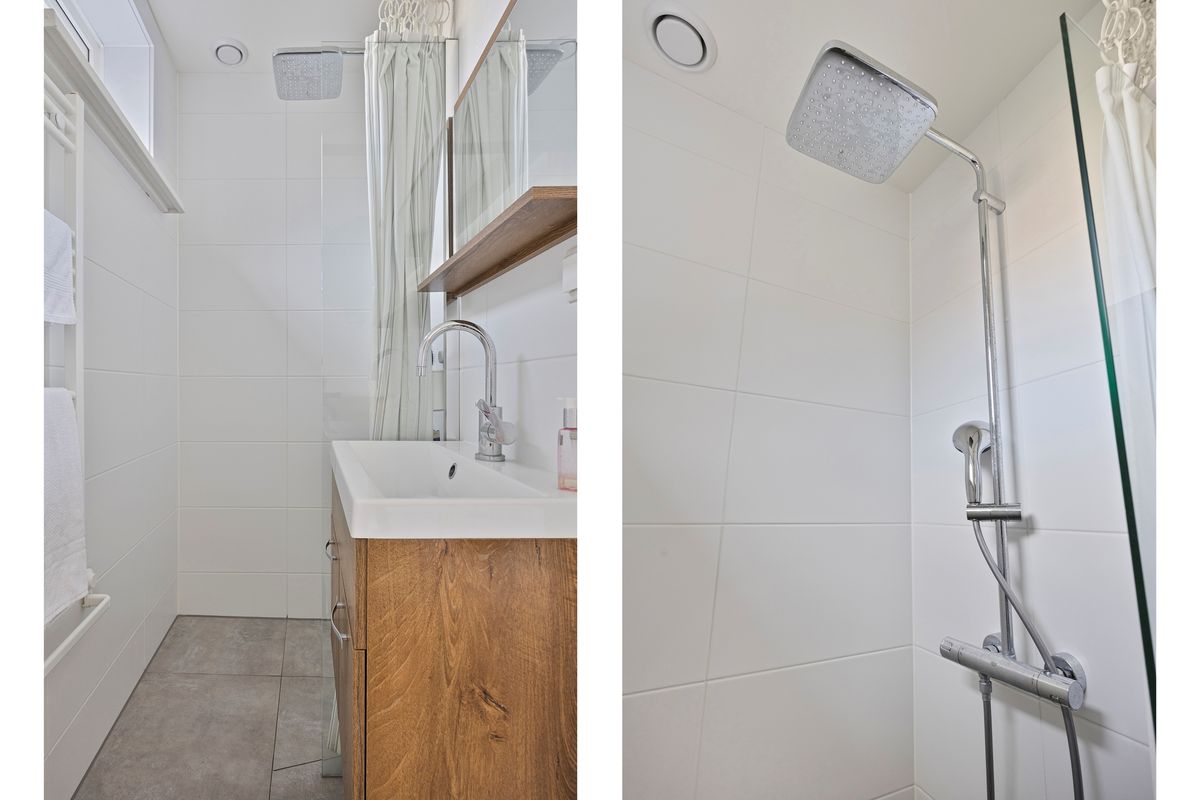 De badkamer is volledig vernieuwd en uitgerust met een inloopdouche met regendouchekop, wastafelmeubel en moderne betegeling. Het toilet is separaat gelegen.