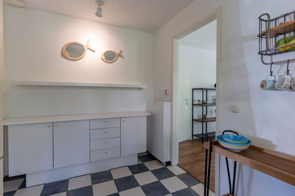 hal met toilet, slaap/werkkamer. L-vormige woonkamer met veel raampartijen en toegang tot de keuken en de bijkeuken.