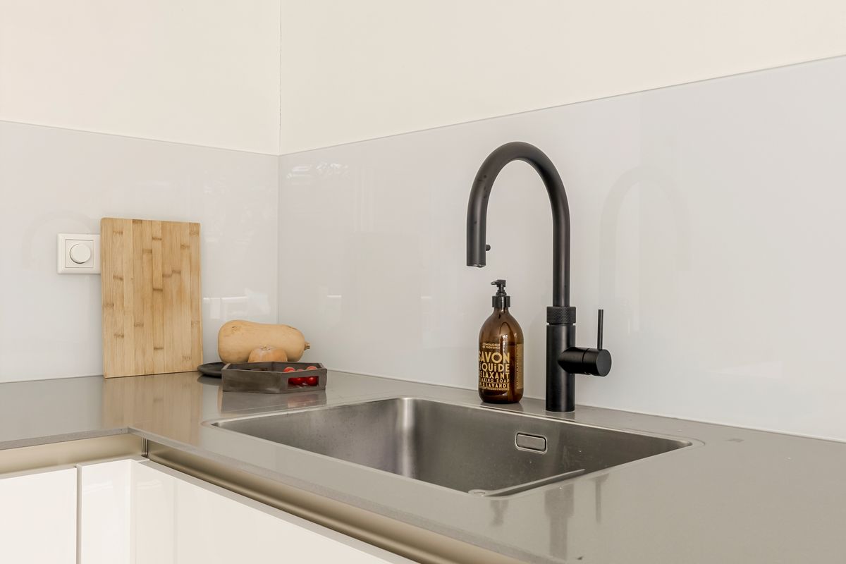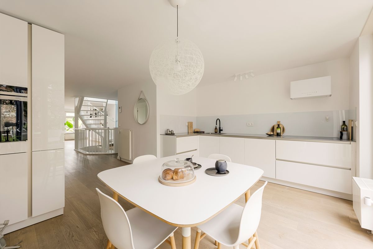 De witte keuken heeft heerlijk veel werk- en bergruimte voor de echte kookliefhebbers. In het midden is plek voor de eettafel. De keuken heeft diverse inbouwapparatuur zoals een koel-vriescombinatie, kokend waterkraan, oven, vaatwasser, inductiekookplaat met stijlvolle afzuigkap en meer dan voldoende opbergruimte.