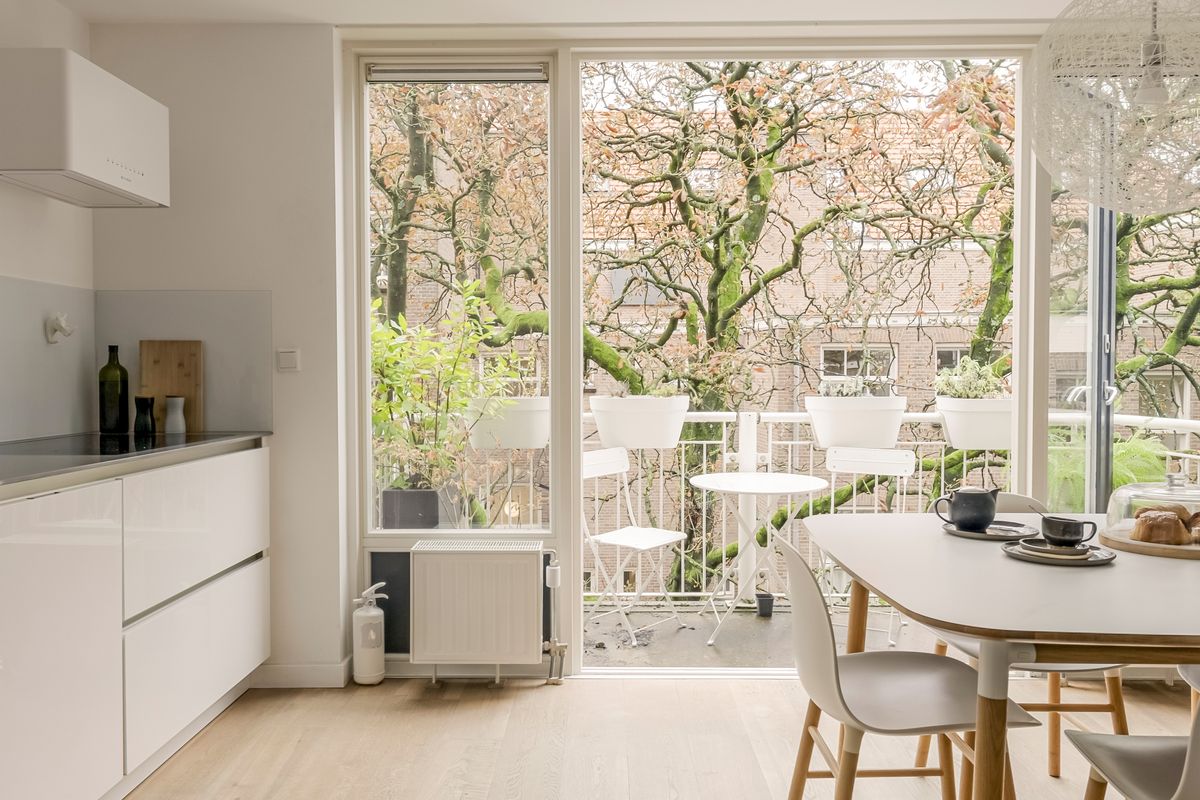 Adjoining the kitchen is a south-facing balcony, perfect for enjoying the morning and early afternoon sun in a peaceful setting, overlooking the green inner courtyard (Stadstuin) of the residences.