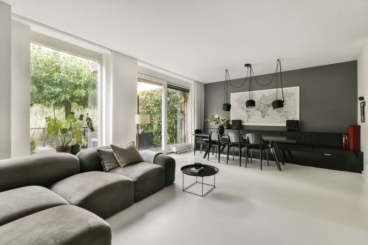 De leefruimte is voorzien van een moderne gietvloer en de grote raampartijen die zorgen voor een overvloed aan licht. De ruime woonkamer staat in directe verbinding met de brede tuin aan het water, een heerlijke plek om te ontspannen en te genieten van de zon, het groen en het vrije uitzicht. De moderne open keuken is uitgerust met hoogwaardige inbouwapparatuur en vormt het hart van het huis.