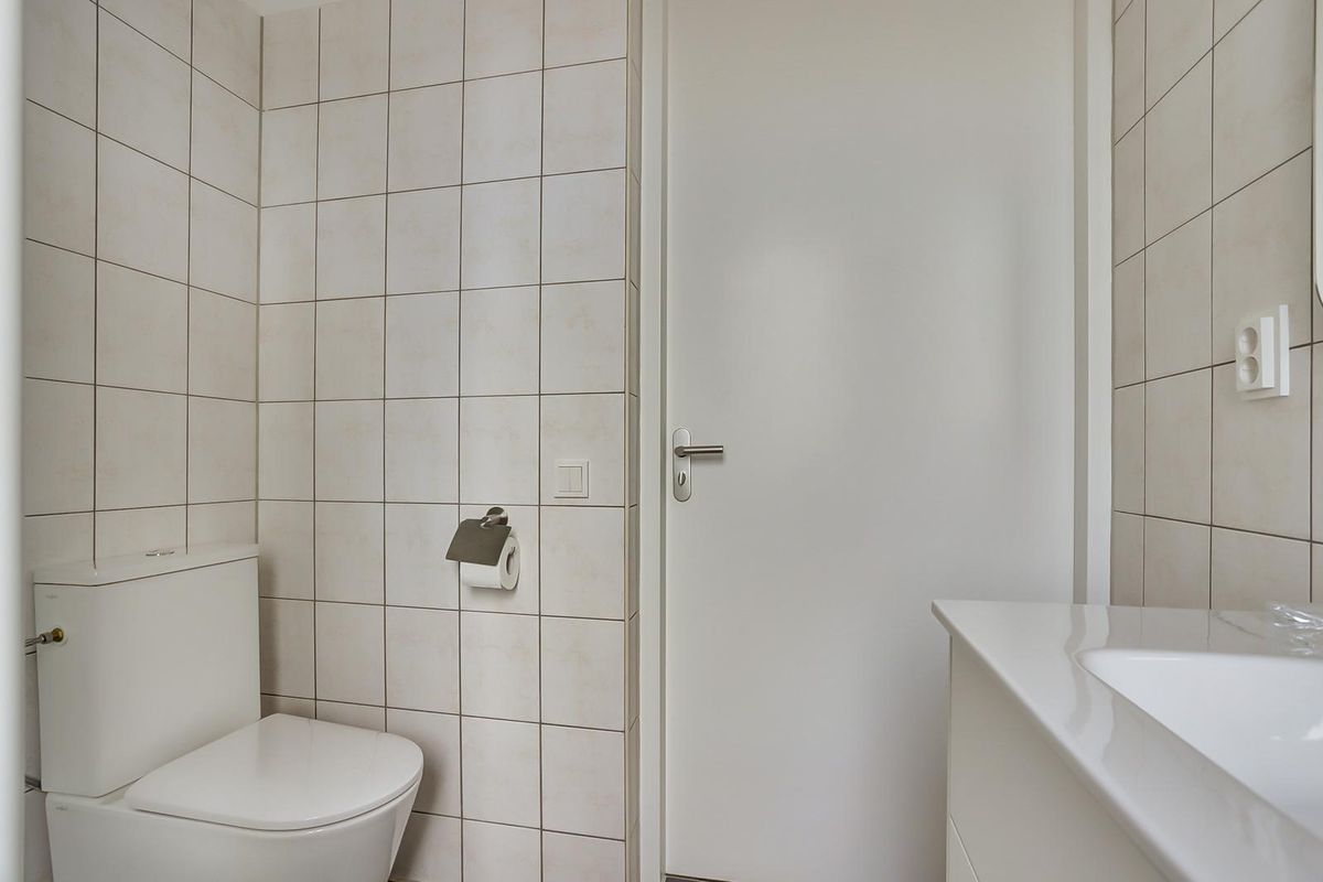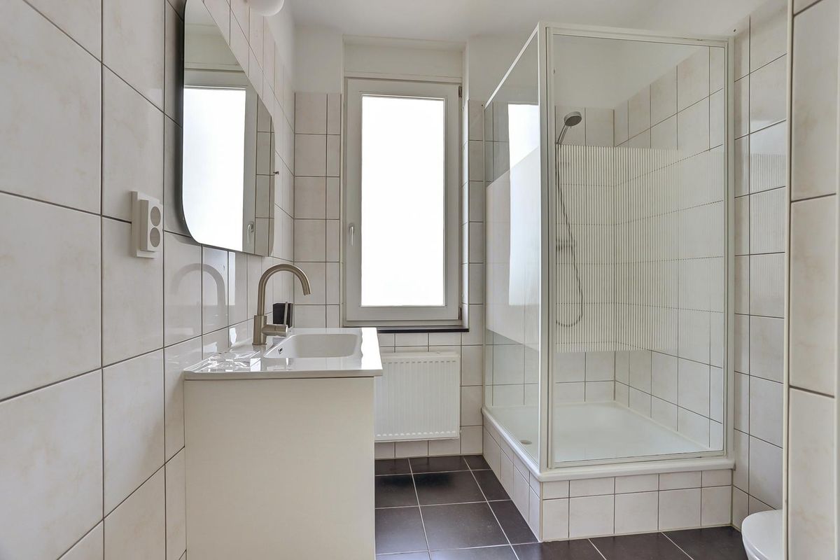 Badkamer: De badkamer is via de hal te bereiken en is volledig betegeld met op de vloer donkere tegels en op de wand witte tegels. Dit zorgt voor een mooi ruimtelijk effect. Er is een nieuw wastafelmeubel aanwezig, een douchecabine en een nieuw toilet.