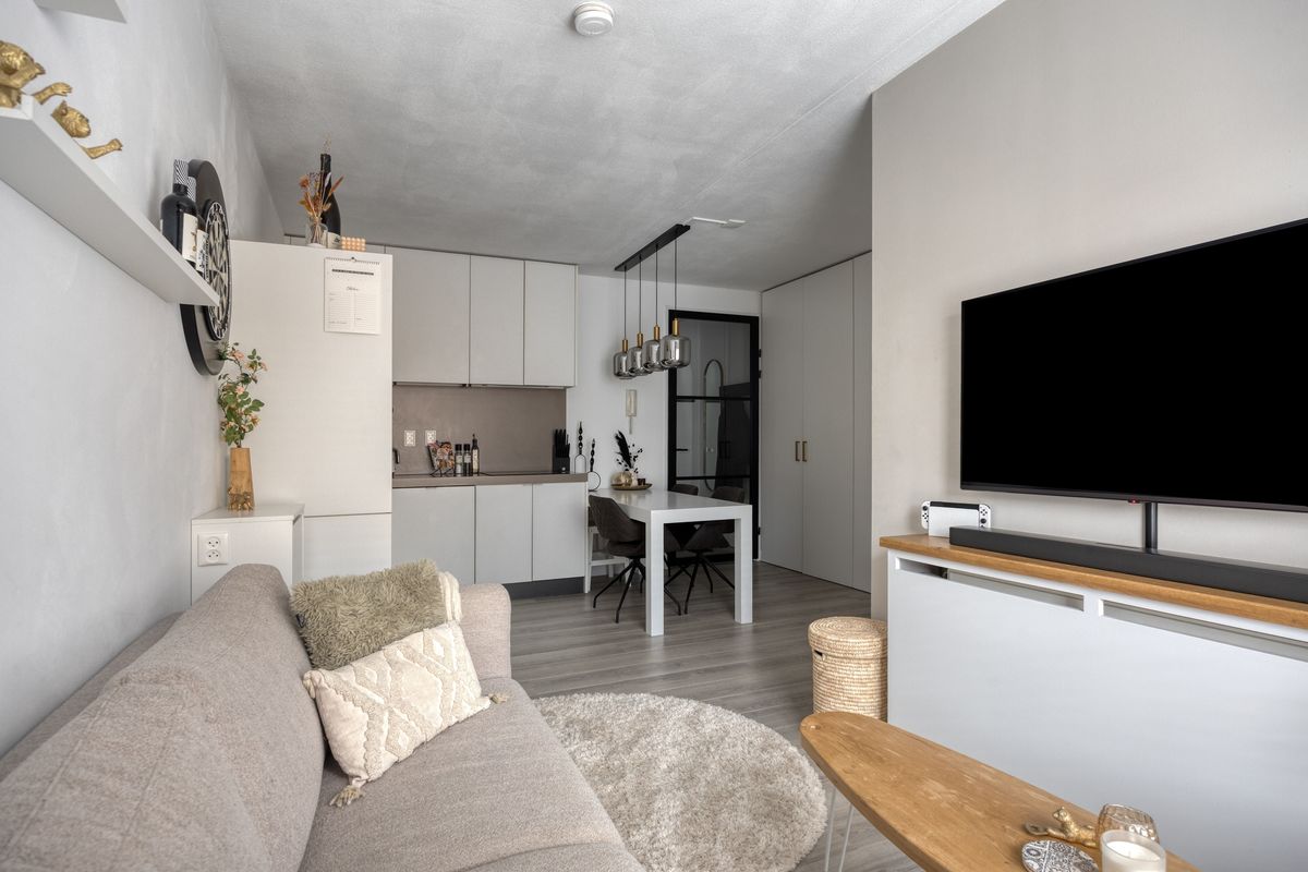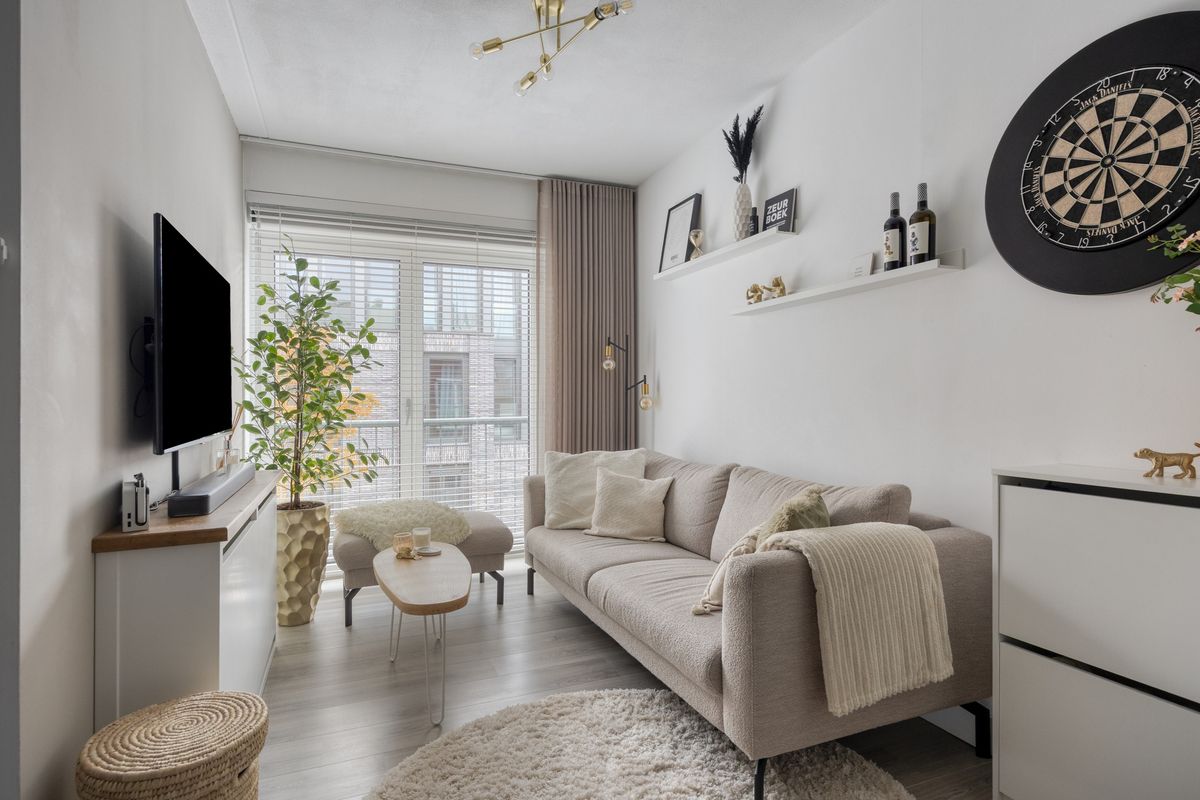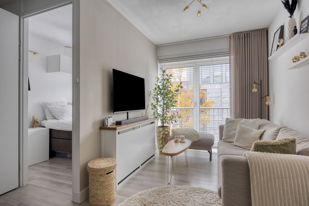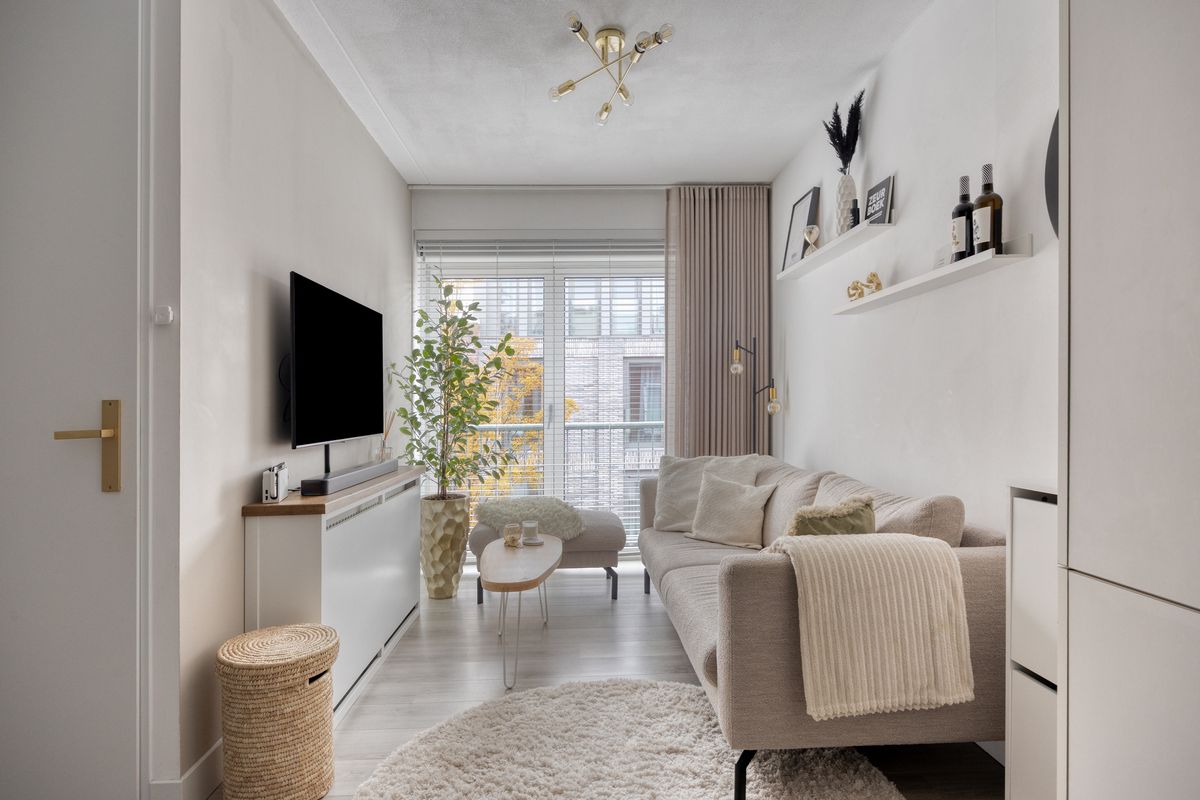 De woonkamer met Frans balkon en openslaande deuren is aangenaam licht en sfeervol. Hier kun je comfortabel wonen en genieten van de aangename ruimte.