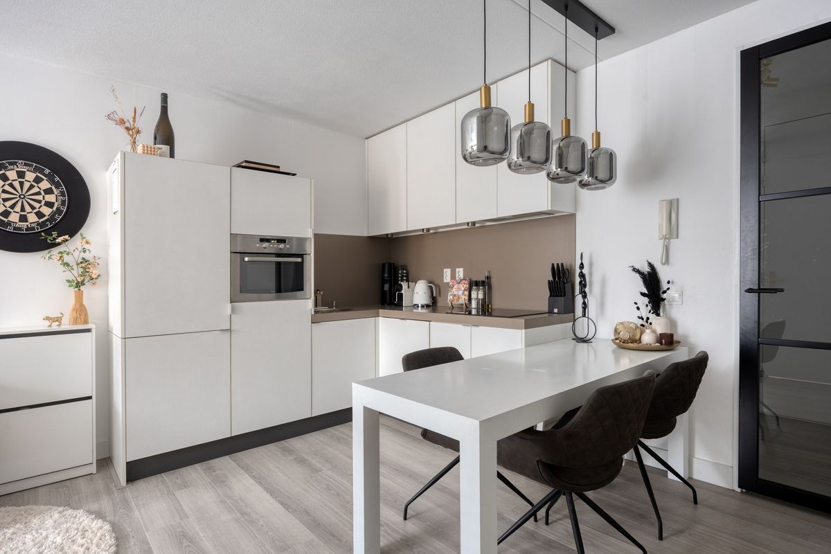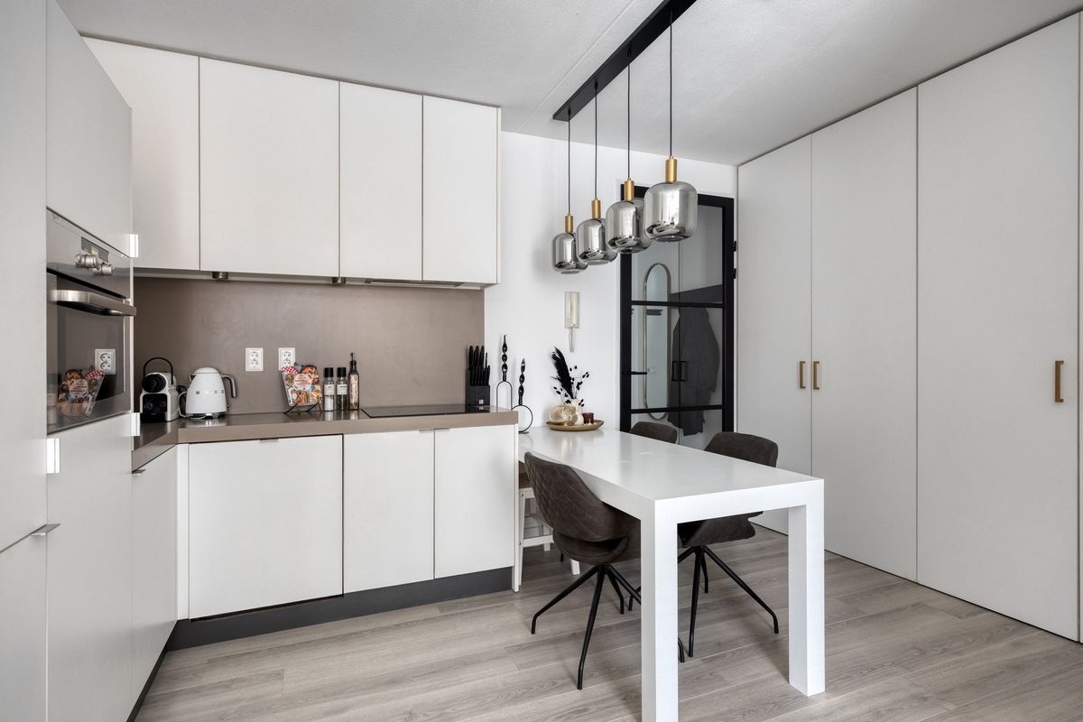 De moderne keuken in hoekopstelling is uitgerust met diverse inbouwapparatuur waaronder een koel-vriescombinatie, vaatwasser, combimagnetron, afzuigkap en inductie kookplaat. Daarnaast biedt de woonkamer meerdere vaste kasten met voldoende opbergruimte.