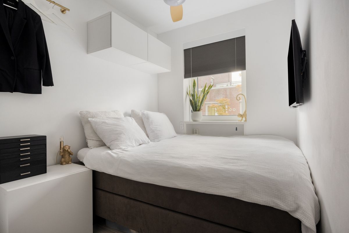 De slaapkamer, gelegen aan de straatzijde van het appartement, is netjes, fris en vormt een rustige plek om te ontspannen.