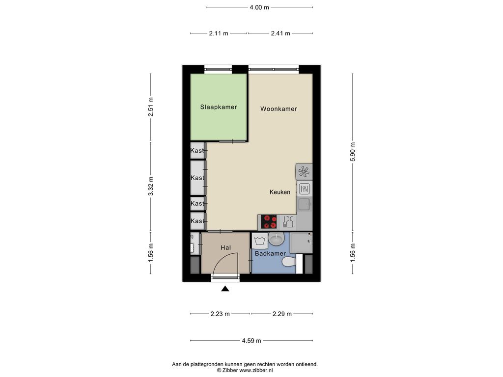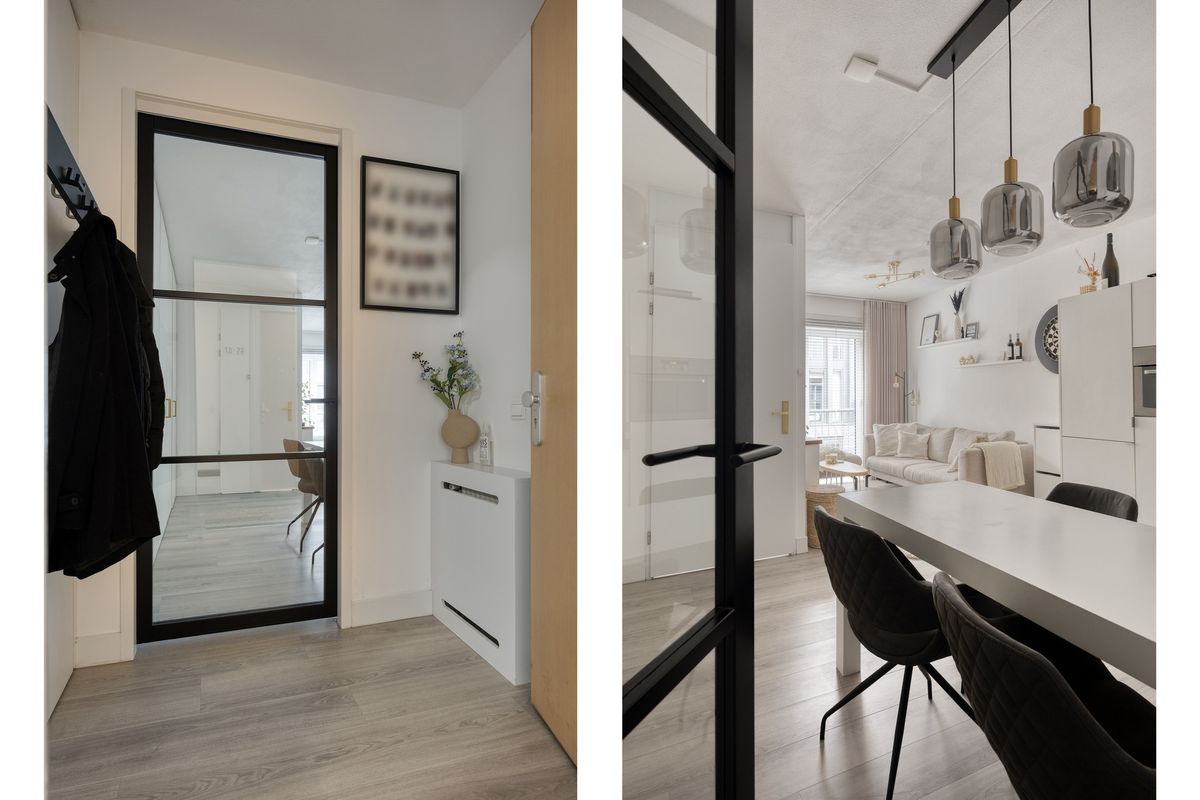 Bij binnenkomst in het appartement kom je in een nette hal met moderne vloerafwerking. Vanuit de hal zijn de meterkast, de badkamer en de woonkamer bereikbaar.
