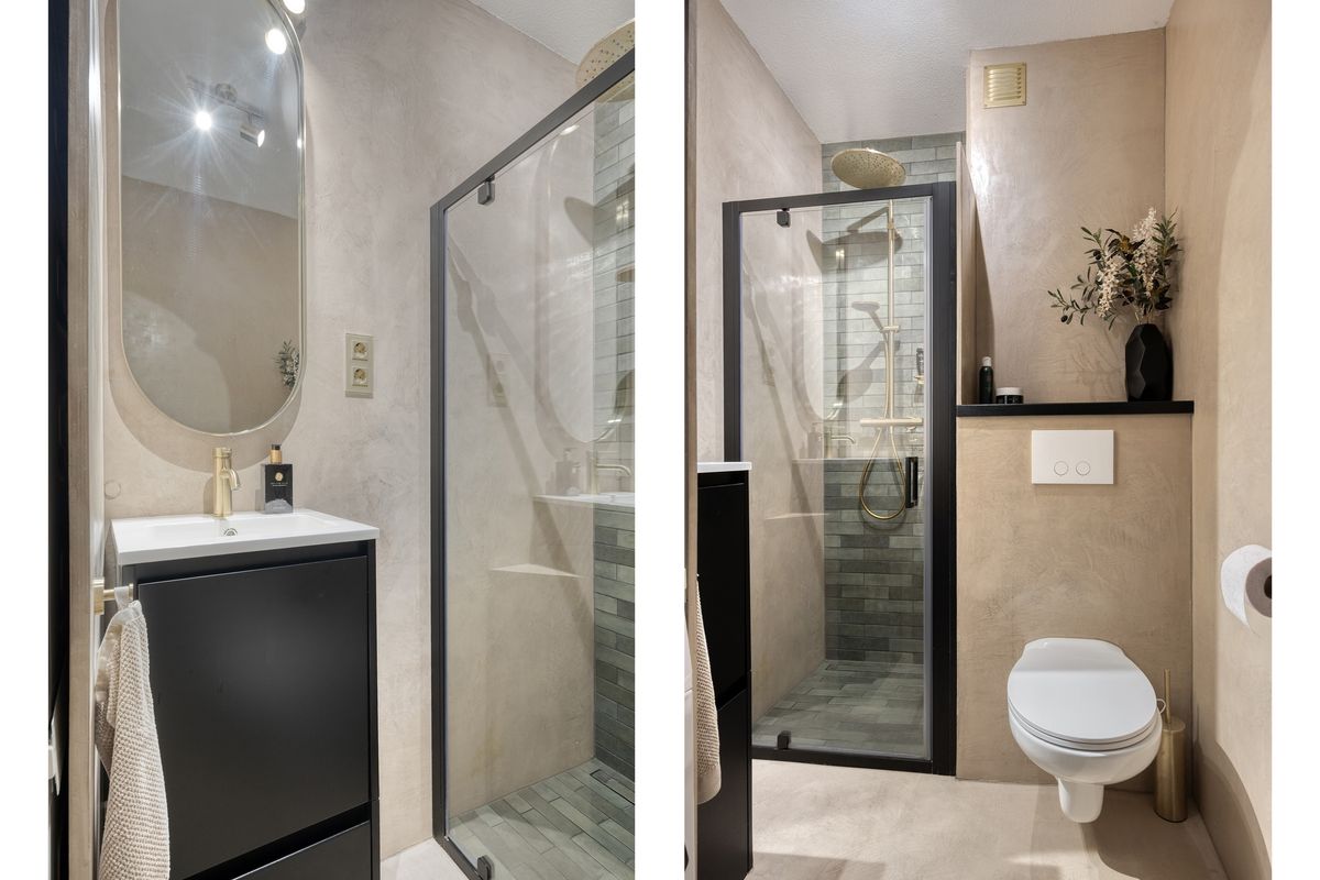 De recent vernieuwde badkamer is voorzien van een douchecabine, wastafelmeubel met spiegel, hangend toilet en aansluitingen voor wasapparatuur.