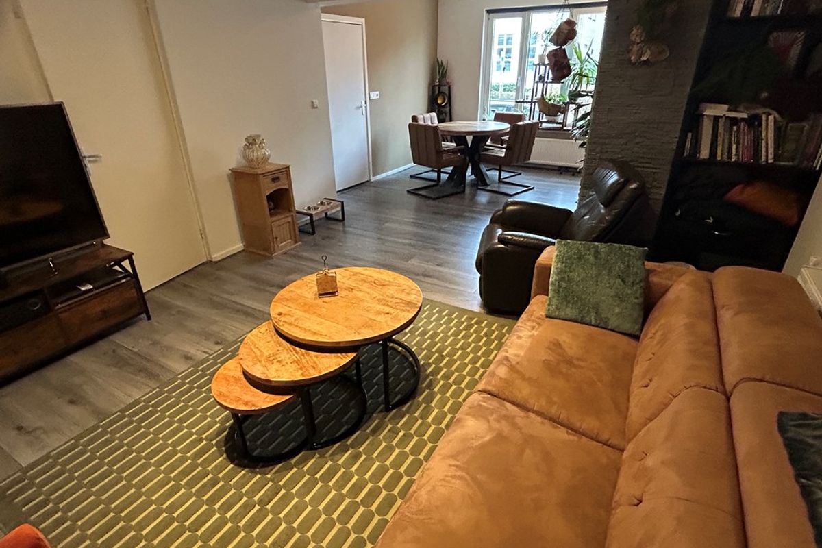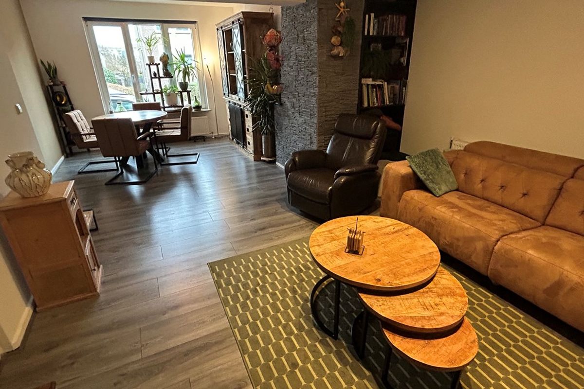 Woonkamer 7,85 x 4,10/3,55 met laminaatvloer en deur naar portaal.