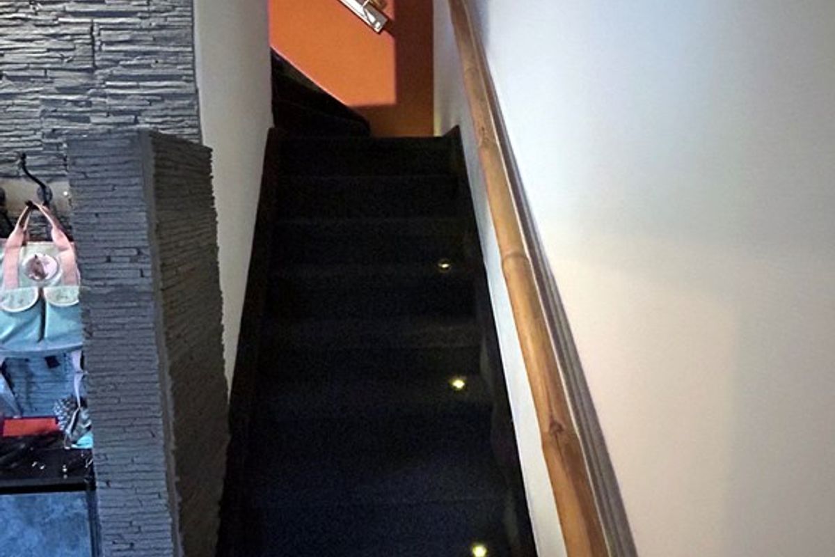 Entree/hal 3,30 x 2,05 met natuurstenen vloer, nieuwe meterkast met slimme stroommeter, toiletruimte 1,10 x 0,75 met hangtoilet en inbouwspot, deur naar woonkamer en trap met LED-verlichting naar verdieping.