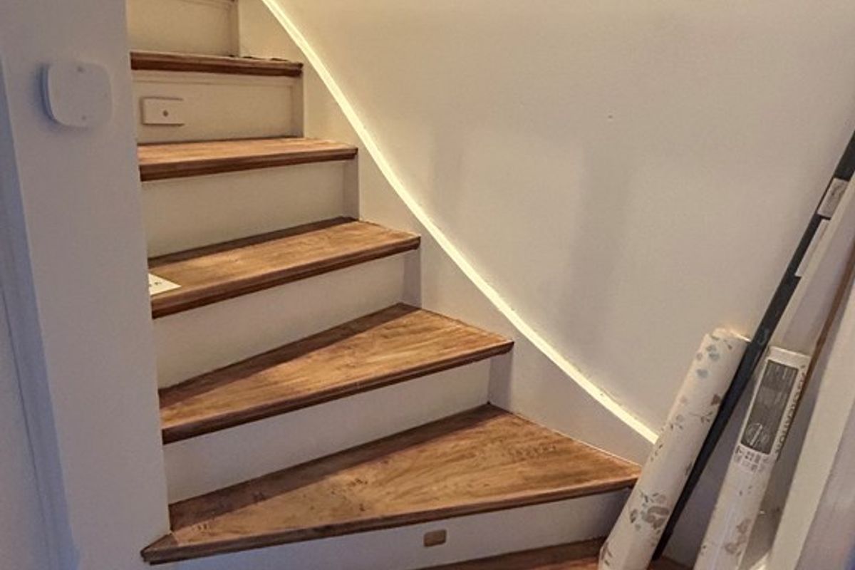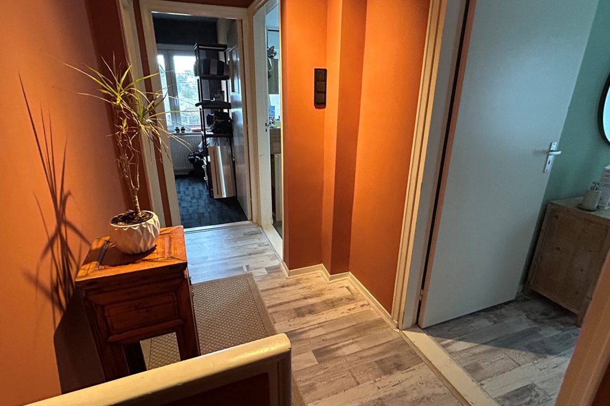 Overloop 3,60 x 1,50/1,10 met laminaatvloer en vaste trap naar tweede verdieping.