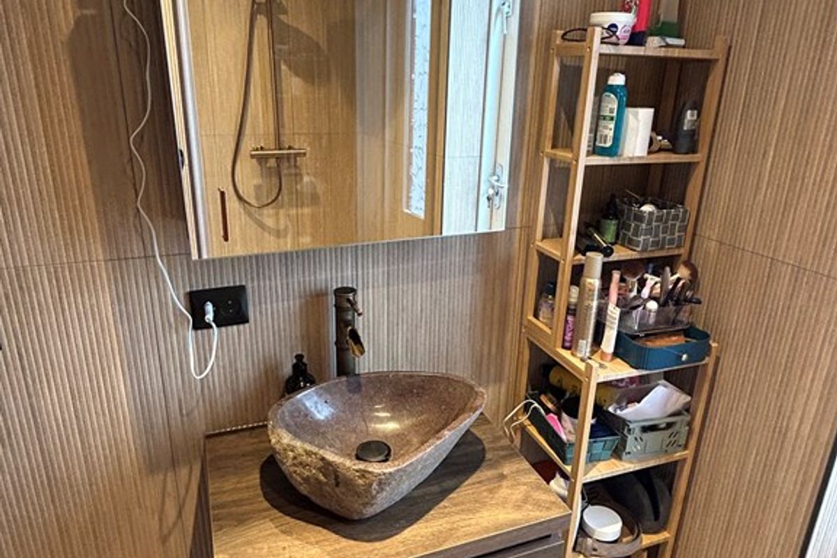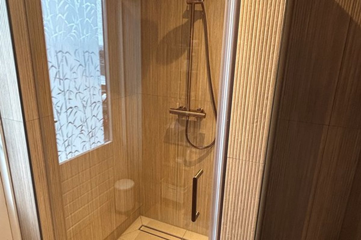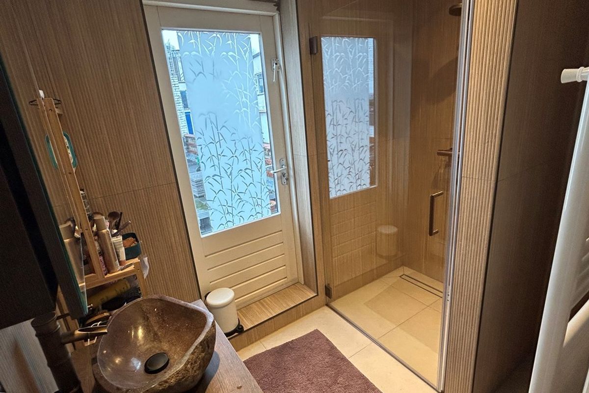 Nieuwe badkamer 2,40 x 1,55 met plavuizenvloer, inbouwspots, inloopdouche, badkamermeubel met wastafel, design radiator en deur naar dakterras 2,50 x 2,00.
