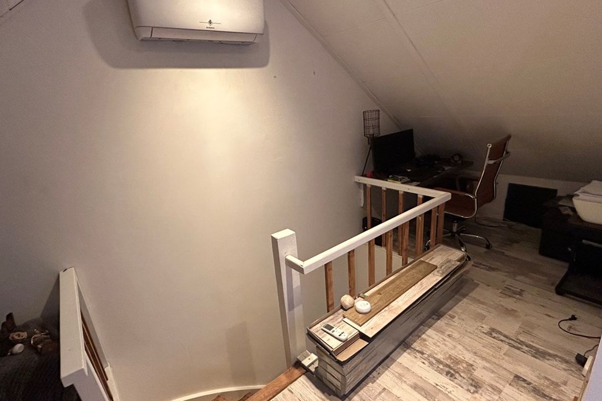 Overloop 3,55 x 2,50/2,05 met laminaatvloer, airco, berging onder schuine gedeelte dak en deur naar slaapkamer 4.
