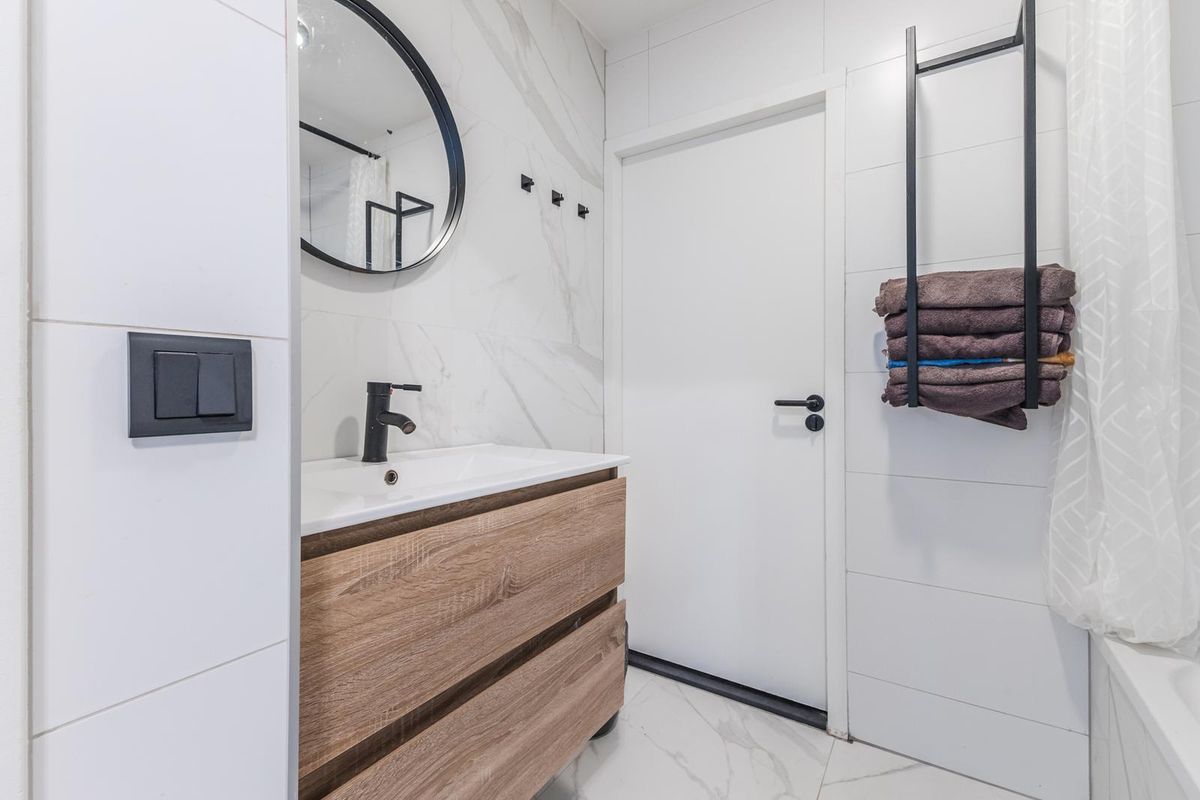 Upon entering, you’re welcomed by a spacious hallway and an open-plan kitchen equipped with modern appliances and an induction cooktop. From the kitchen, you have access to a pleasant balcony overlooking the garden and adjacent playground — the perfect spot to enjoy the afternoon and evening sun.