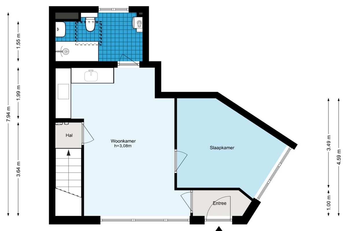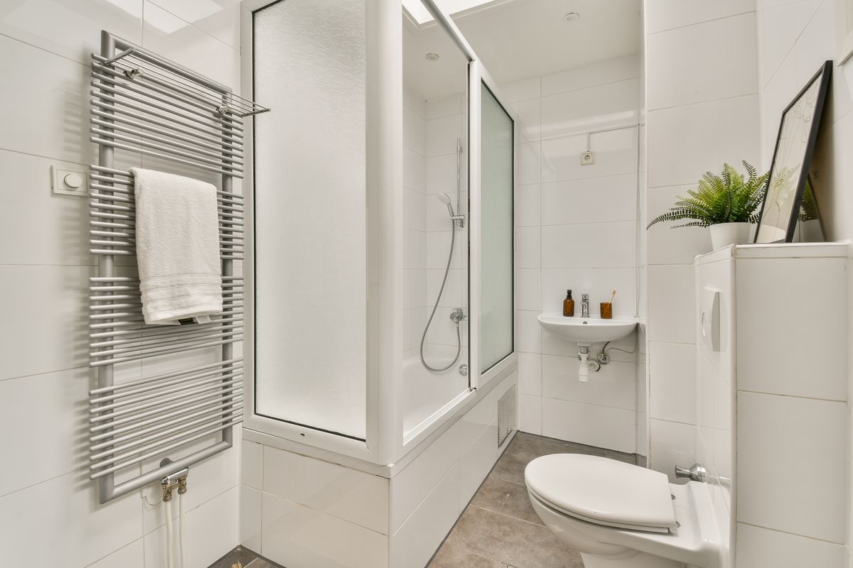 De badkamer is functioneel ingericht en voorzien van een douche, toilet en wastafel. Aan de achterzijde bevindt zich een eerste slaapkamer op de begane grond.