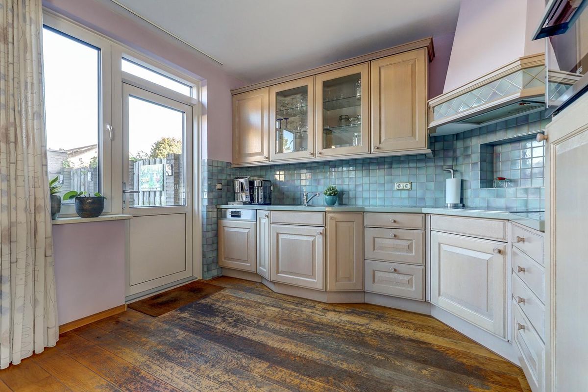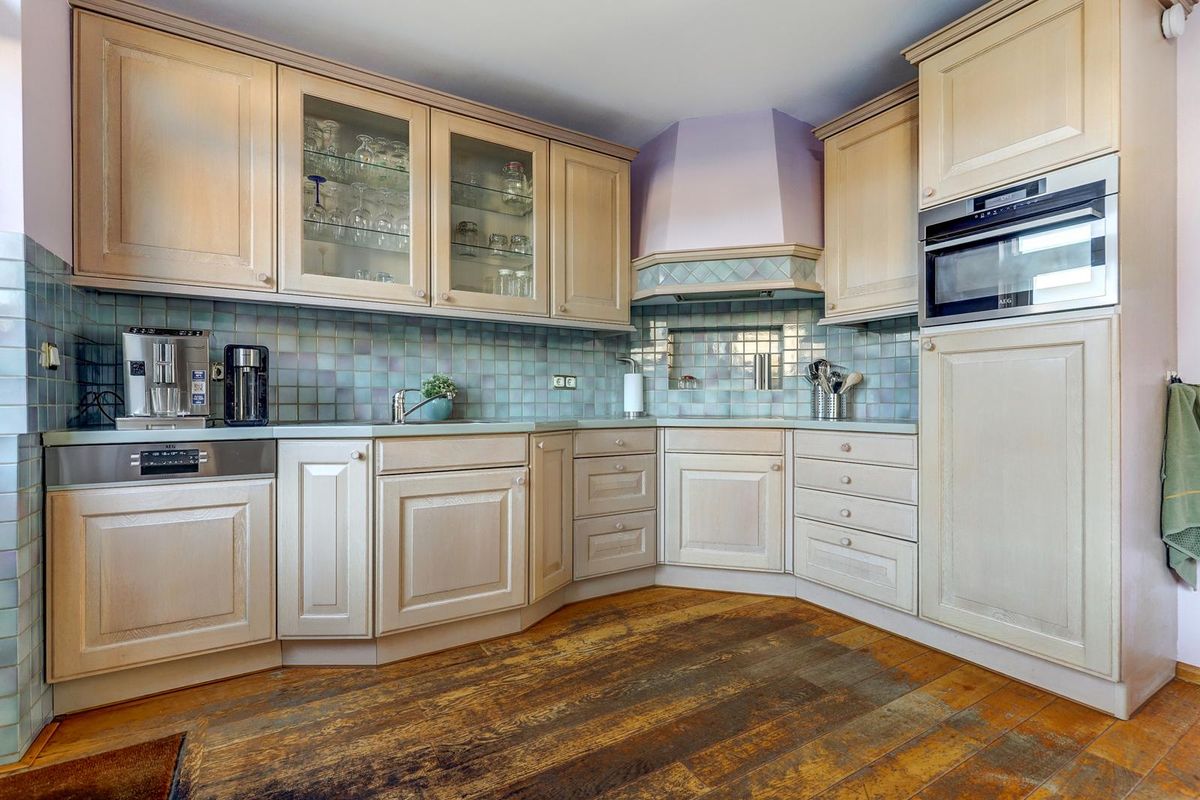 - Keuken: Massief eiken vloer, vlak stucwerkwanden- plafond, bouwjaar 1995, inbouwapparatuur 2017