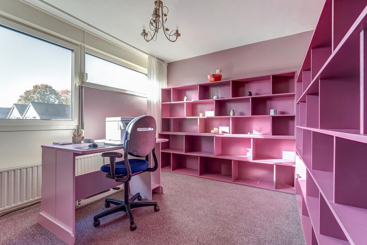 Op de tweede verdieping treft u een ruime vierde slaapkamer, nu in gebruik als hobbyruimte, met twee Velux-dakramen, metalen wasbak, spotverlichting en grote opbergkasten. De overloop met inloopkasten voor extra bergruimte, de andere zijde de was-/droogopstelling en cv-opstelling.
