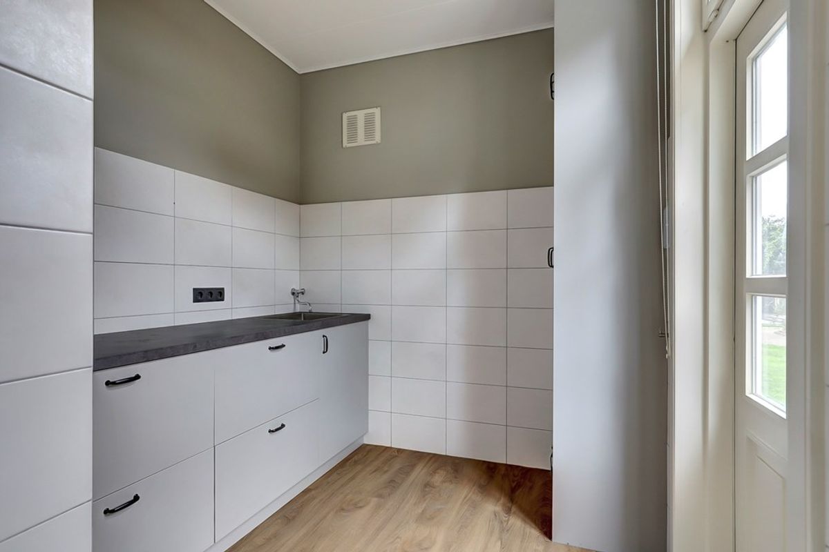 Vanuit de hal loop je door naar de ruime woonkeuken, het hart van het huis. Hoewel de keuken al meer dan vijftien jaar geleden is geplaatst, oogt ze nog steeds tijdloos en sfeervol. De landelijke kastfronten, gecombineerd met het donker granieten werkblad, geven de ruimte een warme, huiselijke uitstraling. Kookliefhebbers kunnen hier hun hart ophalen met maar liefst zes gaspitten, een dubbele oven en een combimagnetron. Verder is de keuken uitgerust met een grote koelkast, vaatwasser en een praktische muurkast voor extra opbergruimte. Er is voldoende plek voor een eettafel en een airco zorgt voor een aangenaam binnenklimaat. Achter de keuken ligt een praktische bijkeuken met een wasbak, inbouwkasten en een toiletruimte met wandtoilet en fonteintje. Zowel vanuit de keuken als de bijkeuken stap je zo de achtertuin in, een fijne verbinding tussen binnen en buiten.