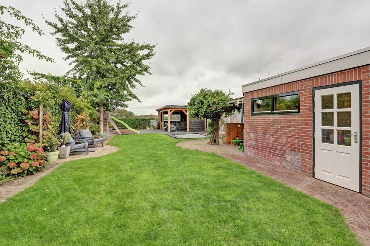 Achter in de tuin ligt de loungeplek, een waar paradijs voor liefhebbers van het buitenleven. Hier kun je urenlang genieten van het vrije uitzicht over de landerijen, dat telkens verandert met de seizoenen. De ruimte is voorzien van een buitenkeuken met wasbak en keukenkastjes (het gasfornuis is nog niet aangesloten), een grote eettafel voor lange zomeravonden én zelfs een zitgedeelte met bank en televisie. Hier wordt binnenleven moeiteloos buitenleven: van borrels met vrienden tot rustige avonden onder de sterrenhemel. De tuin is verder aangelegd met gazon en rijke plantenborders, die het geheel een groene en verzorgde uitstraling geven. Via een poortje aan de achterzijde wandel je zo het platteland op. Verder is de tuin voorzien van buitenkranen, stopcontacten en verlichting, zodat je er ook ’s avonds comfortabel van kunt genieten. Tot slot is er nog een grote garage, bestaande uit twee gedeeltes. In het voorste deel is ruimte om fietsen te stallen of zelfs een auto binnen te zetten, terwijl het achterste deel is ingericht als werkplaats, ideaal voor klussers of hobbyisten. Voor de garage ligt een oprit met dubbele poort waardoor je ook hier gemakkelijk in en uit kunt rijden. En tegen de gevel bij de oprit groeien twee perenbomen die perfect passen bij de landelijke sfeer. Deze tuin is echt een verlengstuk van de woning: ruim, groen, praktisch en vol beleving. Een plek waar elk seizoen zijn eigen charme heeft en waar buiten zijn vanzelfsprekend wordt.