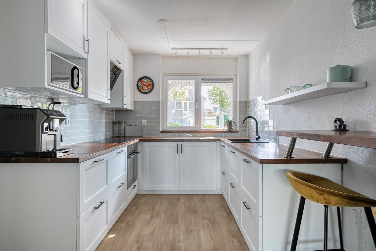 Koken wordt een feestje in deze stijlvolle en praktische U-vormige keuken (2020) met strak witte fronten, een houten aanrechtblad, een gezellig barretje en moderne apparatuur, te weten; inductiekookplaat (AEG), oven (AEG), vaatwasser (AEG), afzuigschouw en een losse Samsung kolkast (ter overname). Een heerlijke plek om samen te koken én te borrelen!