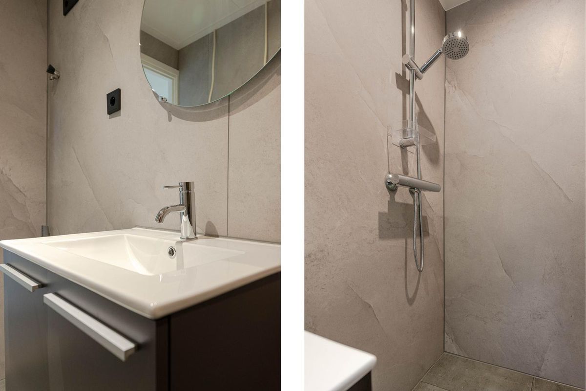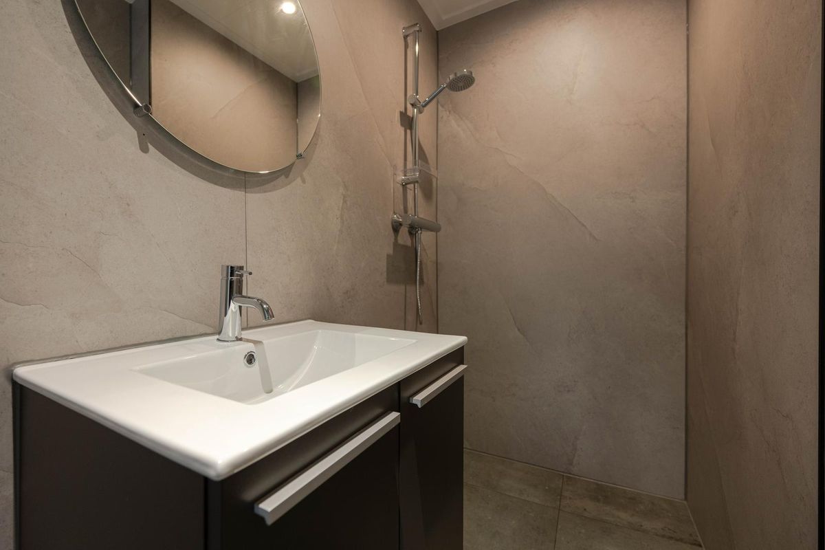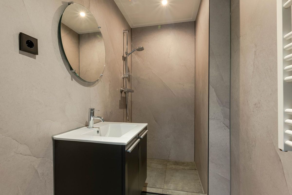 * Badkamer, geheel voorzien van moderne betegeling, inloopdouche, wastafelmeubel, wasmachine-aansluiting, designradiator en verlaagd plafond met inbouwspots.