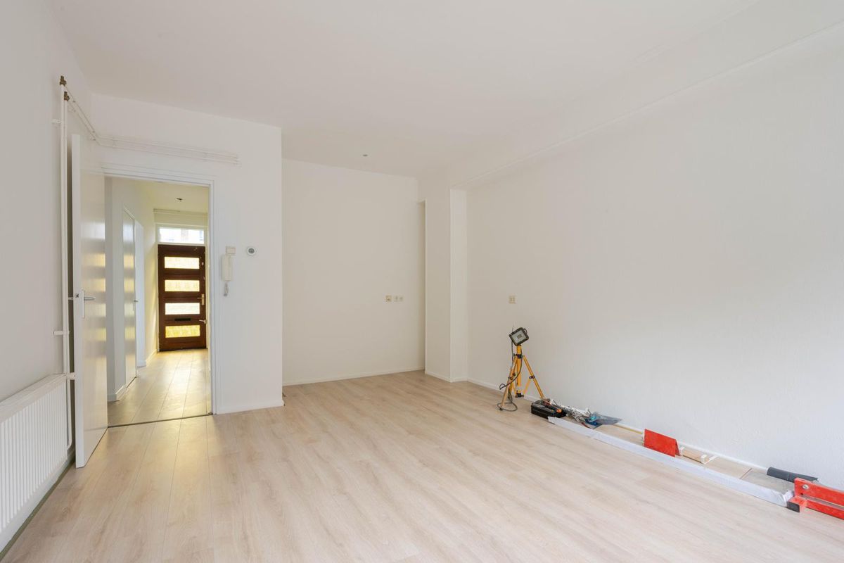 * Woonkamer aan de voorzijde, voorzien van laminaatvloer, gestucte wanden en plafond en een deur naar het balkon.