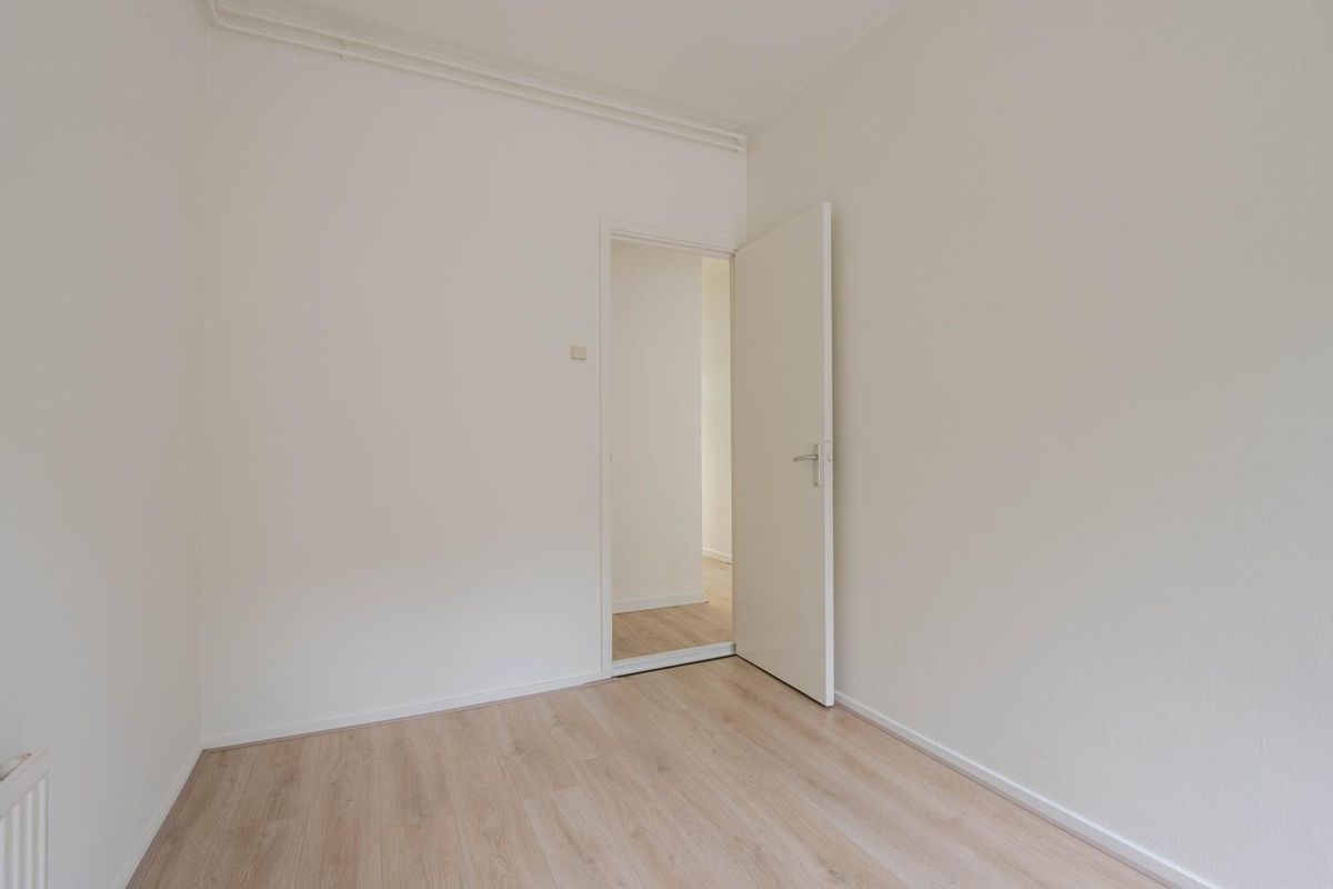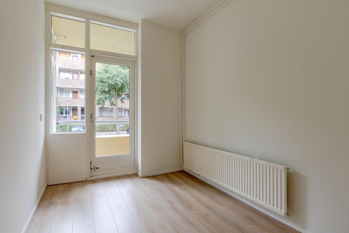 * Slaapkamer I aan de voorzijde, voorzien van laminaatvloer, gestucte wanden en plafond en een deur naar het balkon.