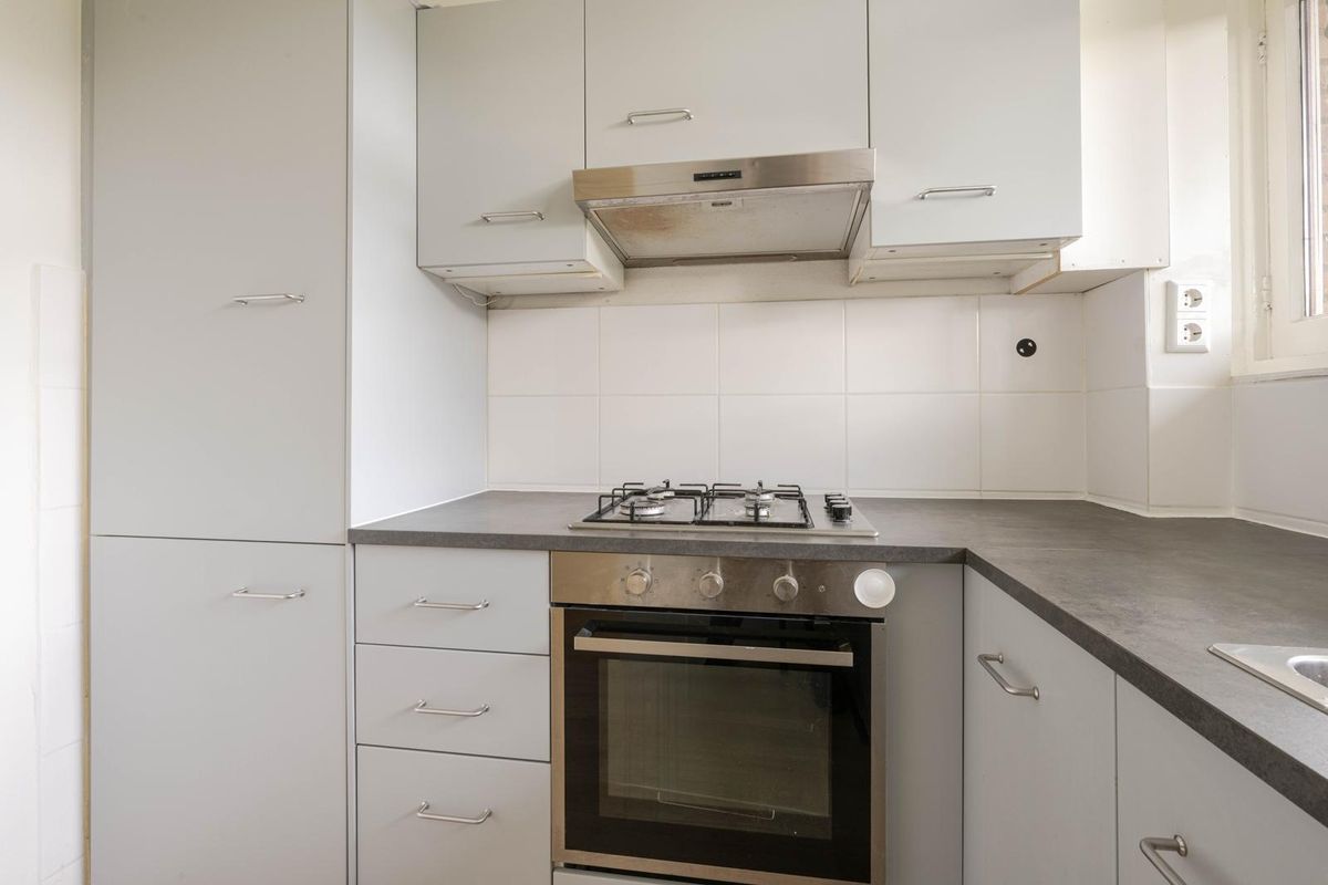 * Keukenruimte voorzien van laminaatvloer met betegelde achterwand en hoek-inbouwkeuken met apparatuur: gaskookplaat, afzuigkap, koel-vriescombinatie en oven.