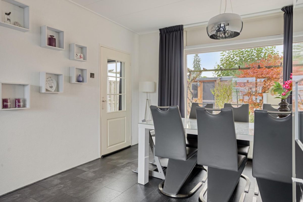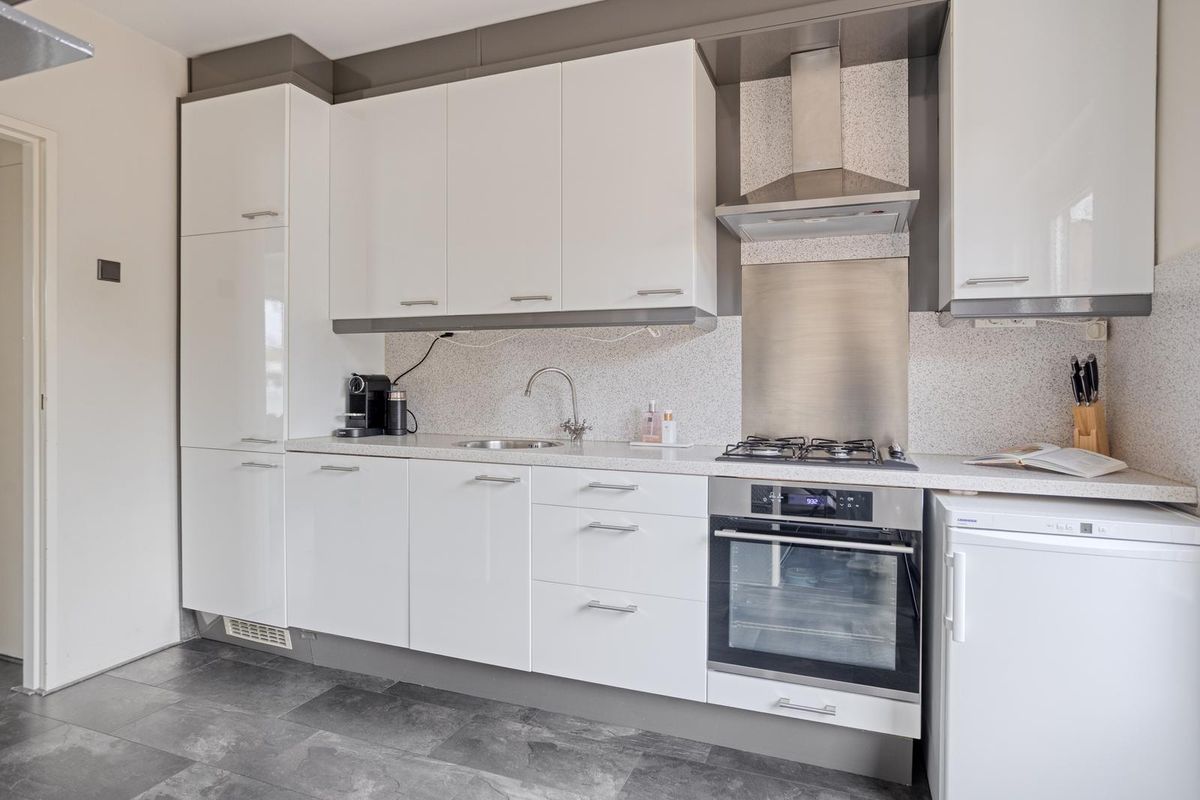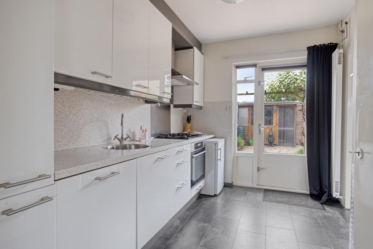 De woonkamer is heerlijk licht met het zitgedeelte aan de voorzijde van de woning. Dankzij de grote ramen aan voor- én achterzijde stroomt het daglicht naar binnen. Aan de achterzijde is ruimte voor een royale eettafel waar je met gemak met z’n zessen kunt tafelen. Via de eetkamer bereik je ook de afgesloten keuken. De keuken is uitgevoerd in wit, met een stijlvol keukenblad en compleet uitgerust met een fornuis, afzuigkap, oven, koelkast en vaatwasser. Vanuit de keuken heb je toegang tot de achtertuin.