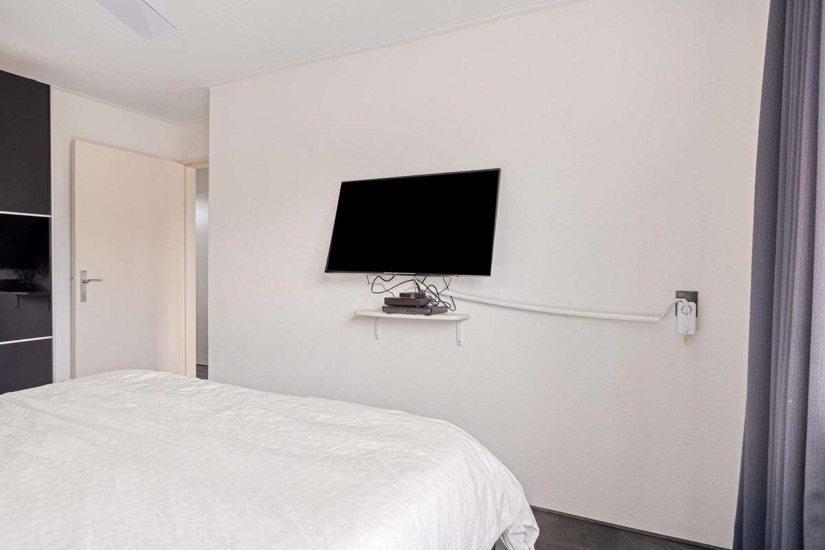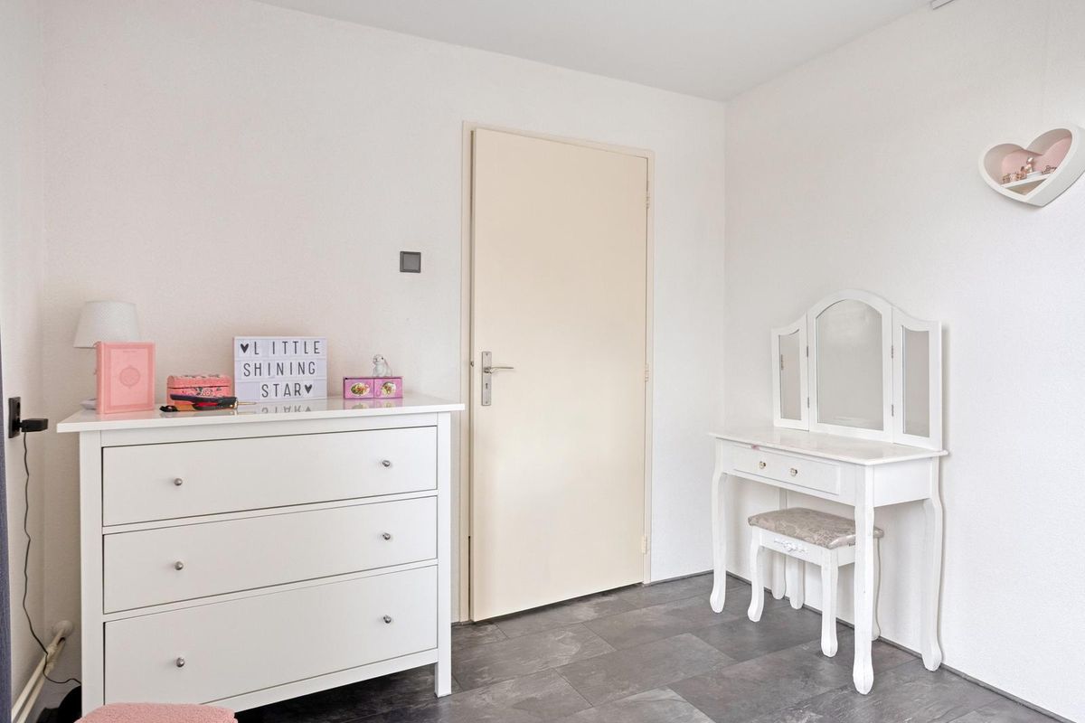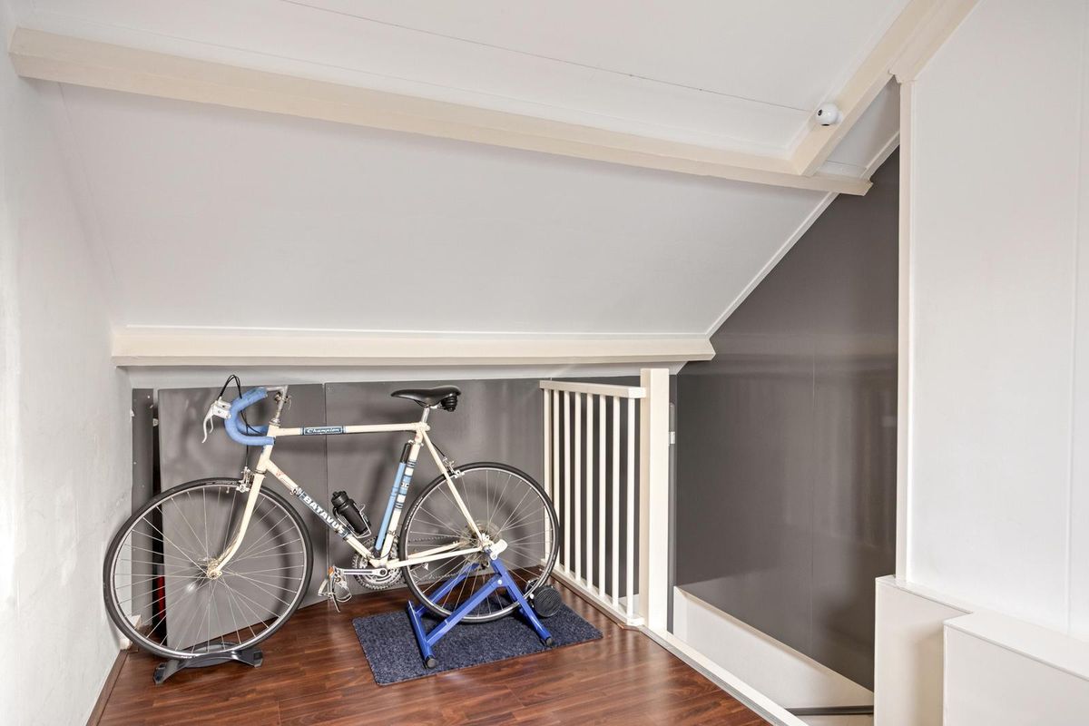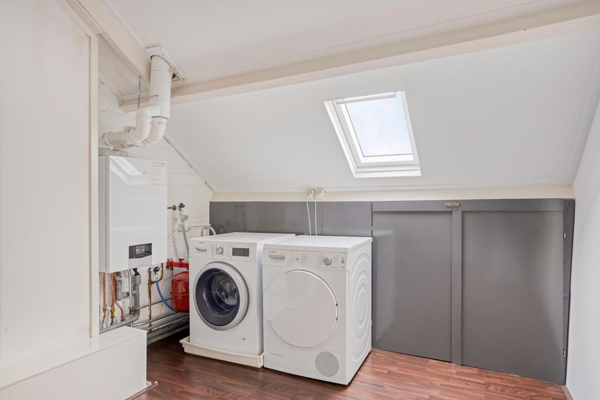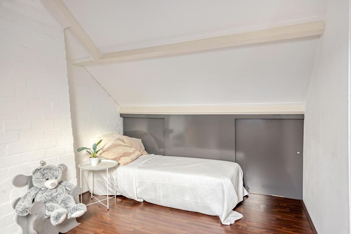Op de eerste verdieping bevinden zich drie slaapkamers, stuk voor stuk voorzien van de donkere vloer en strak wit geschilderde wanden. De master bedroom ligt aan de achterzijde en biedt ruimte aan een tweepersoonsbed en een grote kledingkast. De andere twee kamers zijn perfect in te richten als kinderkamer, werkruimte of hobbykamer. De badkamer is keurig en functioneel, met een douche en een wastafelmeubel. Via een vaste trap kom je op de tweede verdieping. De ruime overloop beschikt over aansluitingen voor de wasmachine en droger én volop kastruimte. Ook hier weer een dakraam voor natuurlijk licht. Daarnaast is hier de vierde slaapkamer, eveneens voorzien van een dakraam en slimme opbergruimte. Ideaal als logeerkamer, werkplek of slaapkamer.
