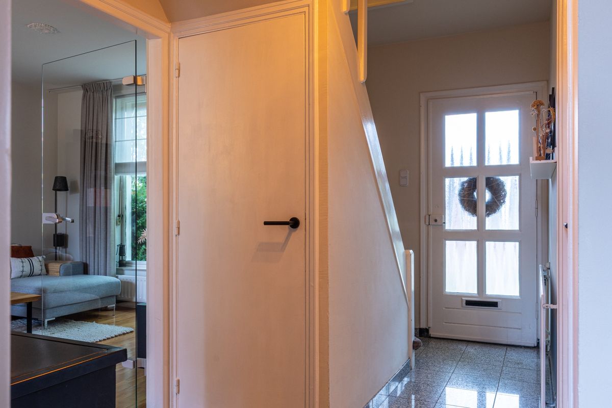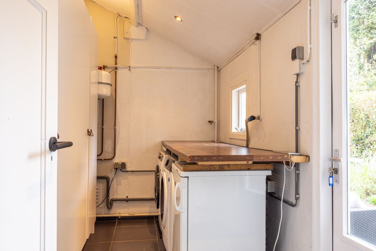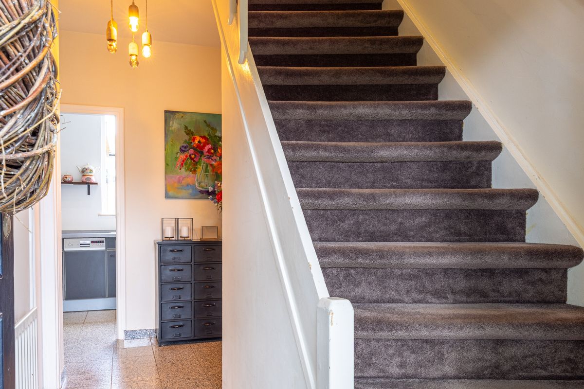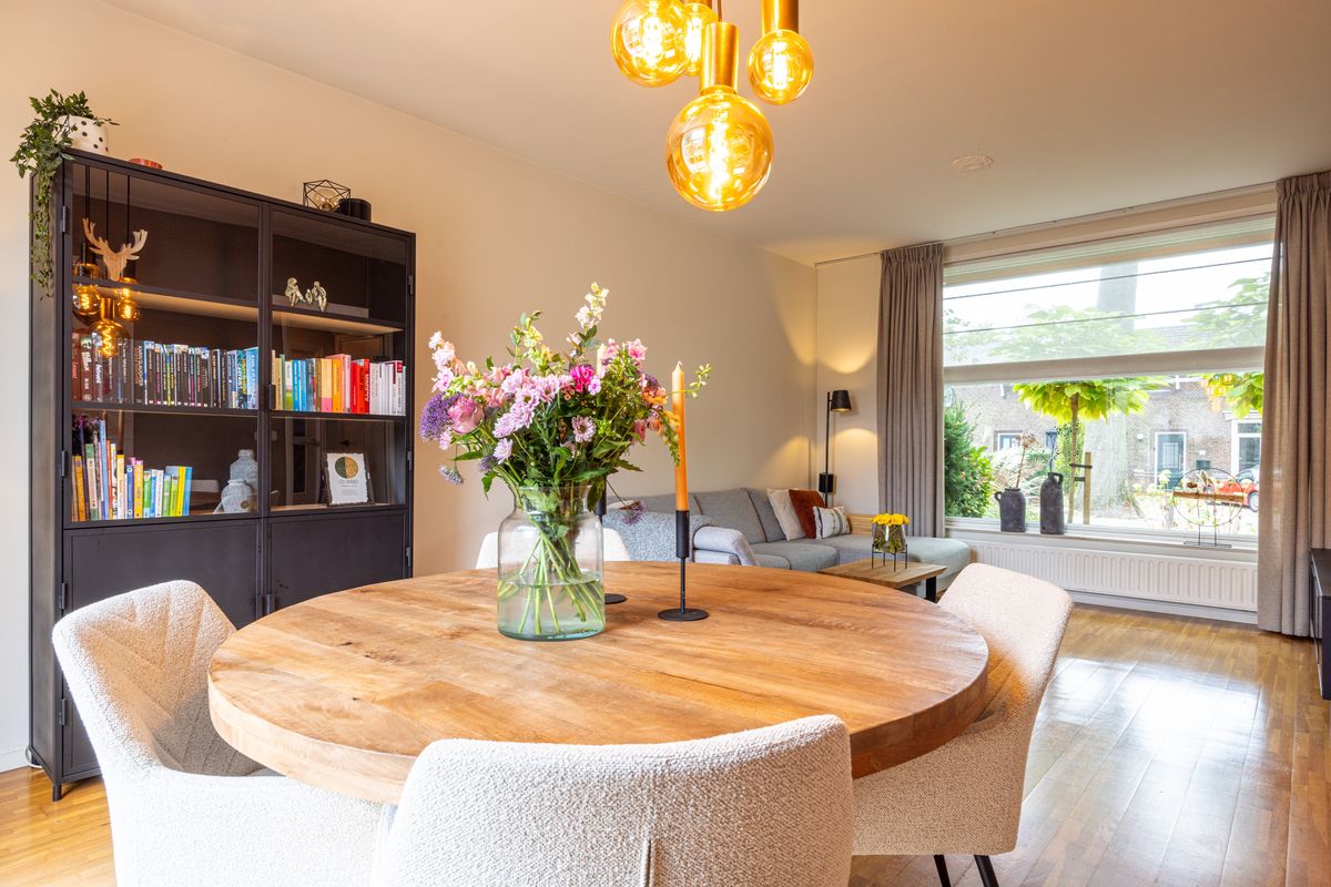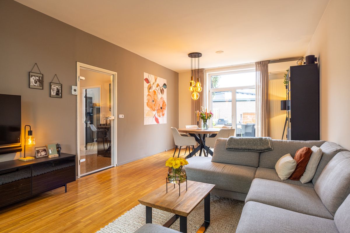 Aan de achterzijde zorgen de grote tuindeuren voor direct contact met de achtertuin, waardoor binnen en buiten op een aangename manier in elkaar overlopen.
