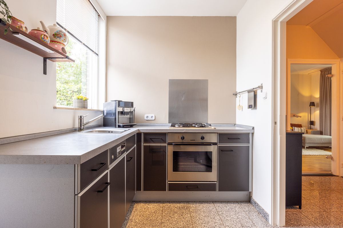 Aan de achterzijde van de woning ligt de gesloten keuken, die praktisch is ingedeeld in een L-vormige opstelling, waardoor het werkblad optimaal wordt benut. De keuken is voorzien van een vierpits gaskookplaat, oven en vaatwasser, en biedt een prettige werkplek voor het bereiden van maaltijden. Vanuit de keuken is er toegang tot de bijkeuken, waar zich de witgoedaansluitingen en de cv-installatie bevinden.