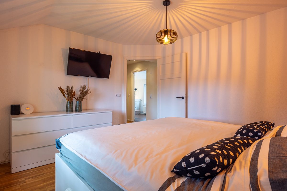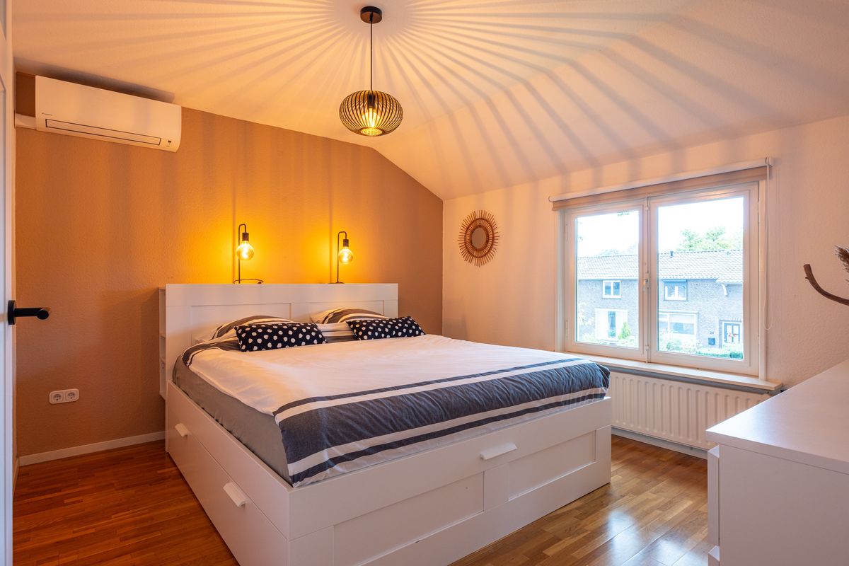 De trap vanuit de hal leidt naar de overloop, die toegang biedt tot drie slaapkamers, allemaal voorzien van een nette laminaatvloer en grote ramen, waardoor de ruimtes licht en prettig aanvoelen. De hoofdslaapkamer beschikt over een airconditioning, wat zorgt voor extra comfort tijdens warme zomers.