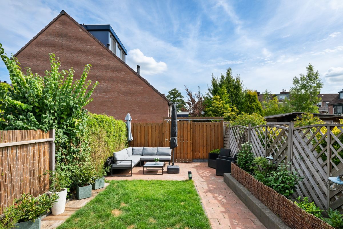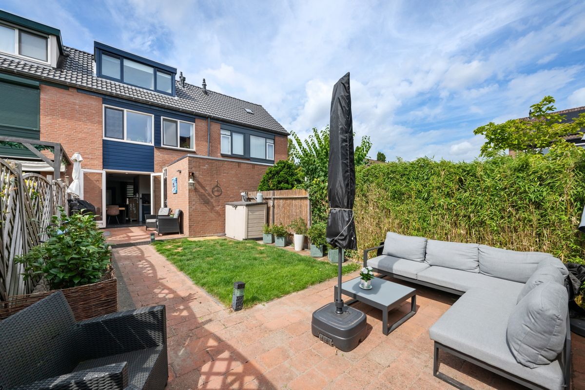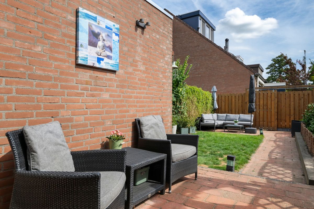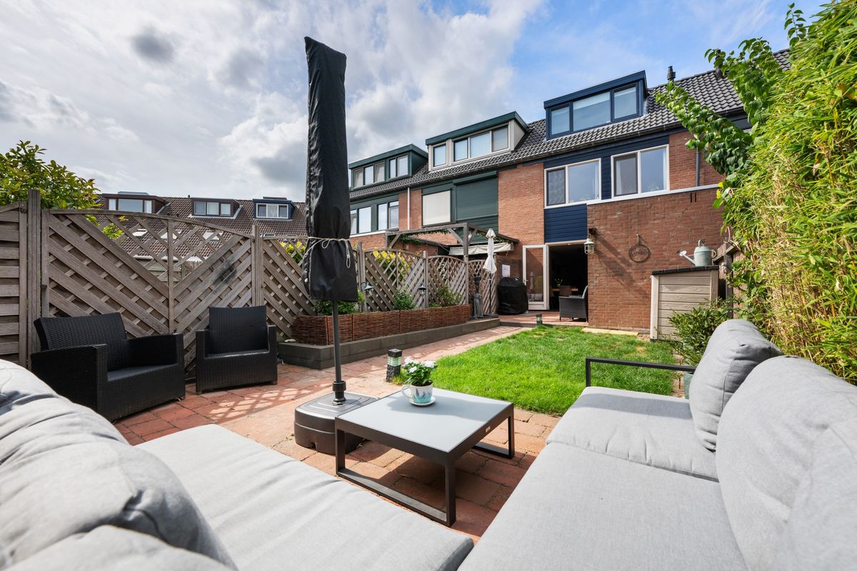 De ruime achtertuin van ruim 12 meter lang en 5 meter breed is gezellig ingericht. Doordat er twee verschillende terrassen zijn is er altijd een plekje in de zon. In de voortuin heb je vanaf einde middag een heerlijk avondzonnetje.
