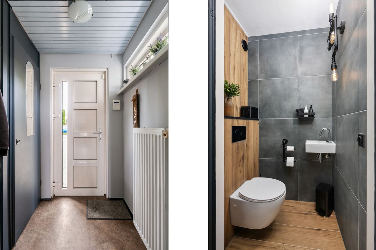 Tussenhal met toilet en trap naar de verdieping. Het toilet is geheel gemoderniseerd en vernieuwd in 2024.