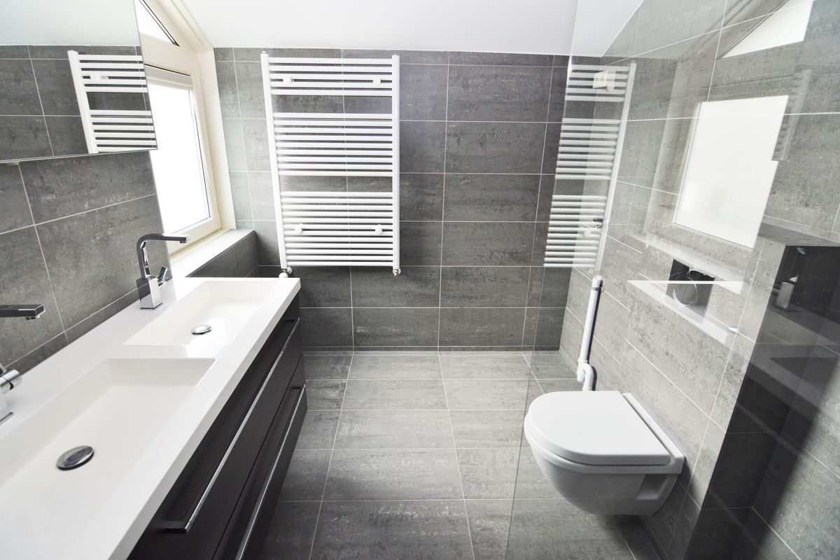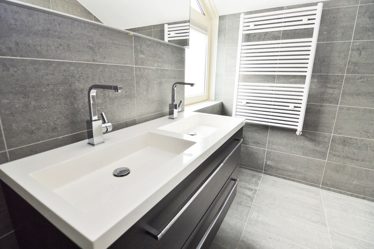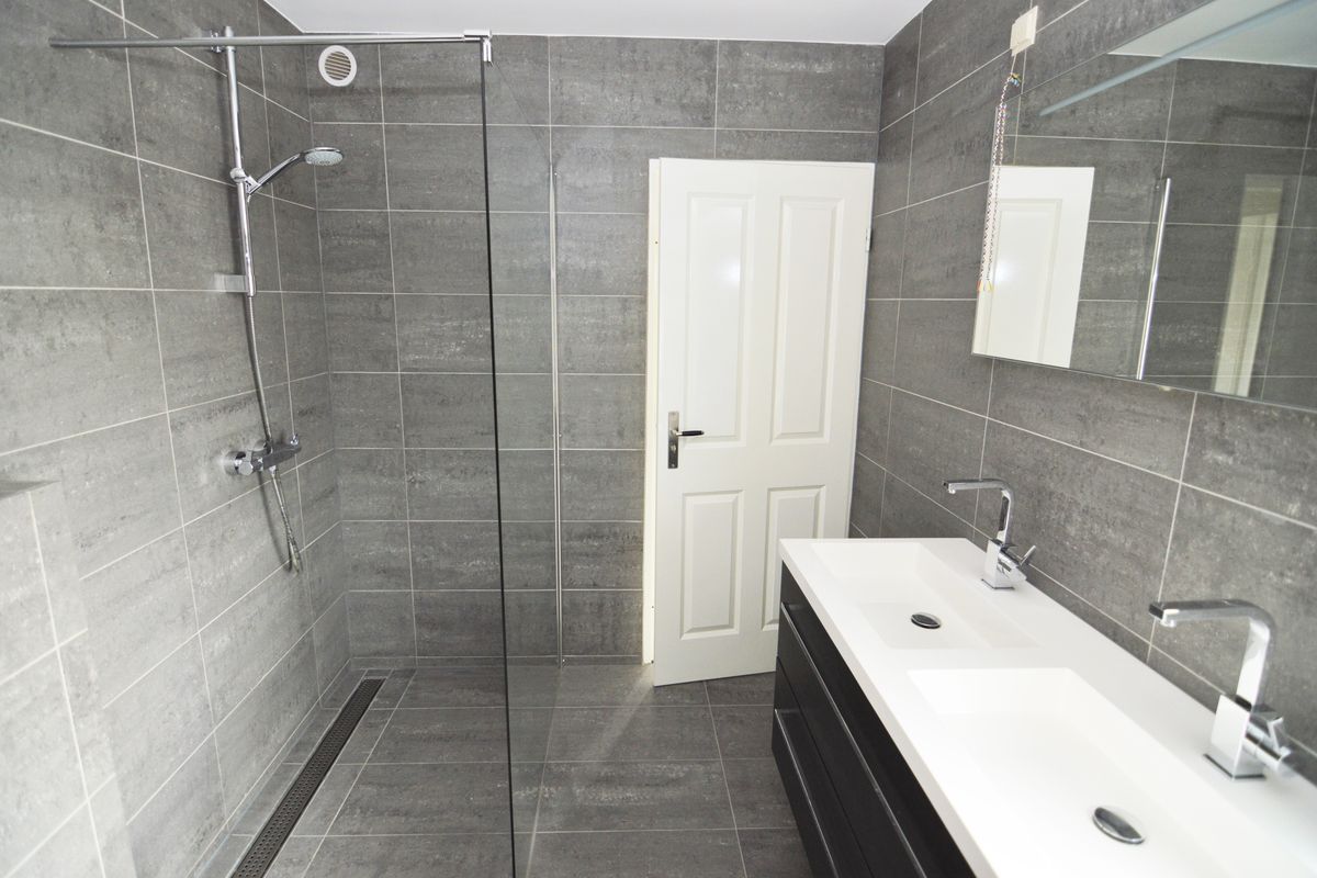 - Badkamer met dubbele wastafel en inloopdouche