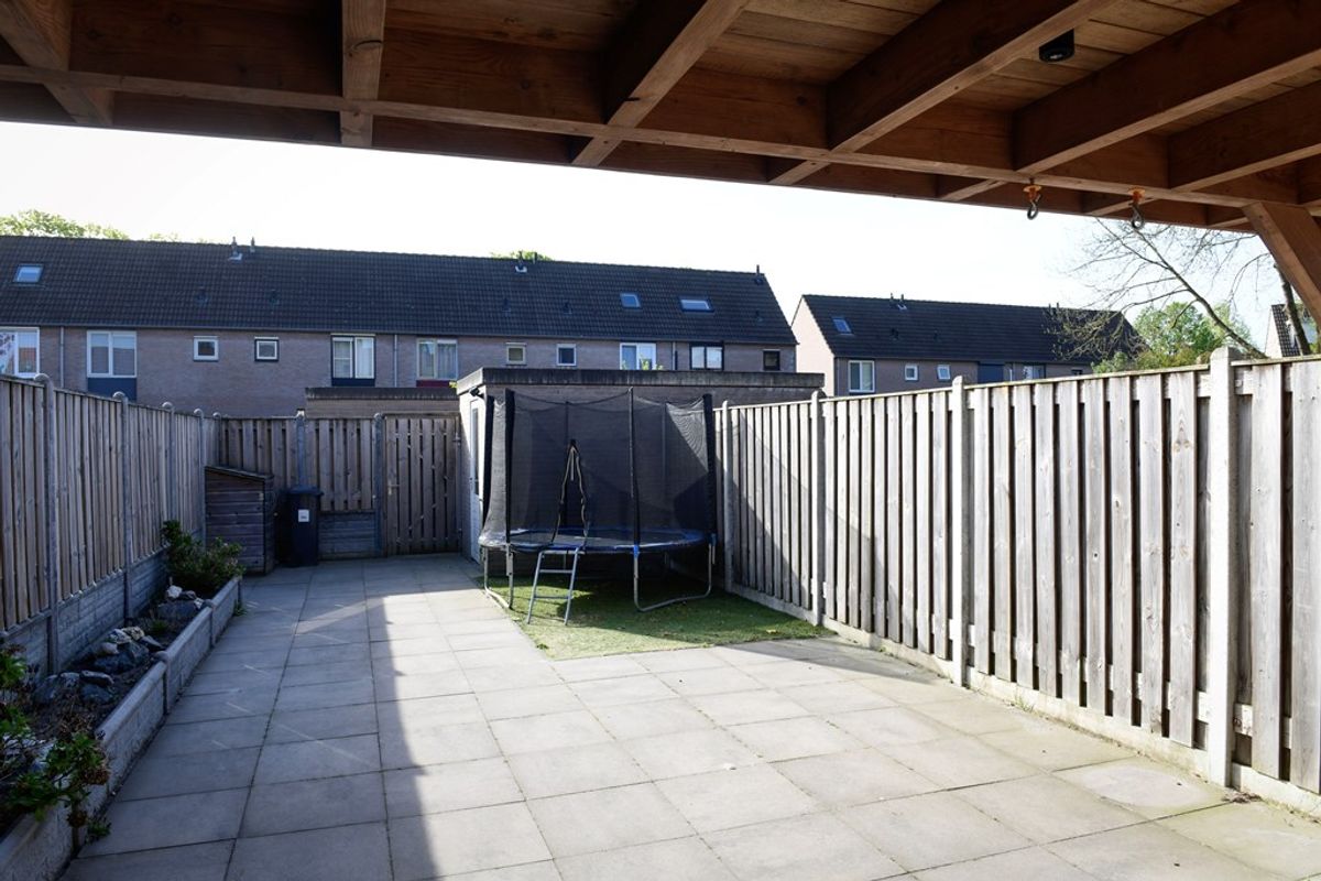 Prachtige achtertuin 14,10 x 5,40 met bestrating, overkapping 5,40 x 3,25 met spotjes, kraan, stenen buitenberging 2,45 x 2,10 met elektriciteit, houten schuttingen met betonnen palen en achteringang.